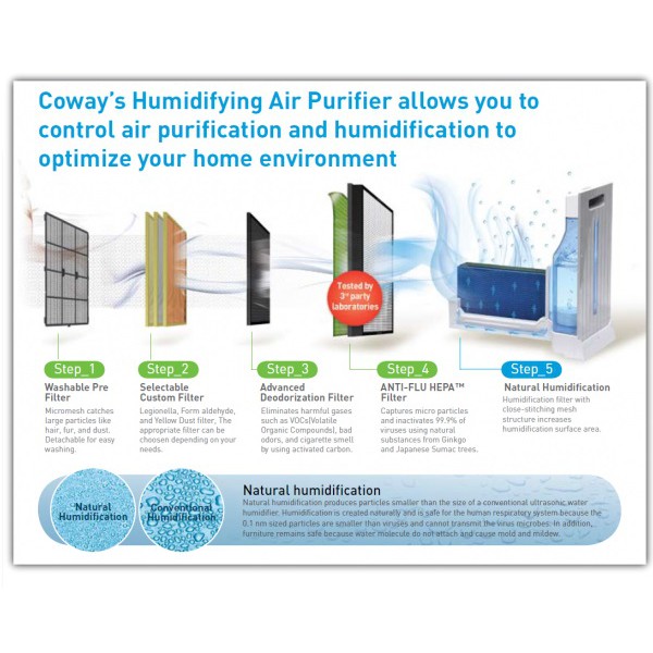 *** Cách tạo ẩm của Máy lọc không khí và tạo ẩm Coway APM-1010DH là lây lan một màn sương của các hạt nước trong không gian. Tạo ẩm và làm sạch không khí là hoạt động hoàn toàn tự động, trong điều kiện không khí được đo liên tục (bởi bụi và cảm biến khí) và được chỉ định bởi màn hình hiển thị của đèn màu, hoạt động của bộ lọc không khí sẽ được điều chỉnh tự động. Ngoài ra, độ ẩm được đo liên tục và chức năng tạo ẩm sẽ kích hoạt nếu độ ẩm giảm xuống dưới giá trị thiết lập của người dùng- Bộ lọc tùy chỉnh cho các ứng dụng khác nhau:
