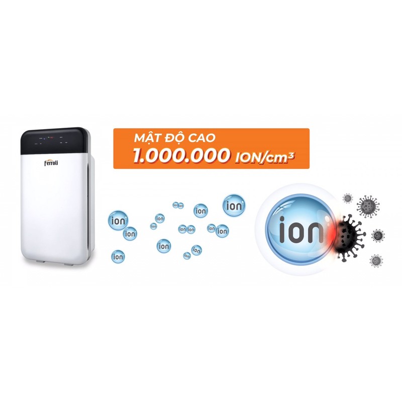 Ionizer công nghệ Hàn Quốc của máy lọc không khí Ferroli FAP-43D giúp tạo ra chùm ion âm với mật độ cao 1.000.000 ion/cm3 đây là mật độ cao nhất hiện nay. Các ion âm sẽ tìm và bám vào các phần từ mang điện tích dương là các chất gây ô nhiễm, mùi hôi, nấm mốc, vi khuẩn ion hóa chúng và làm sạch không khí. Với mật độ ion này bụi bẩn, vi khuẩn, virus sẽ được ion hóa và tiêu diệt nhanh hơn và nhiều hơn. Không khí sẽ nhanh chóng trở nên trong lành, rút ngắn thời gian hoạt động với công suất cao giúp tiết kiệm điện hơn.