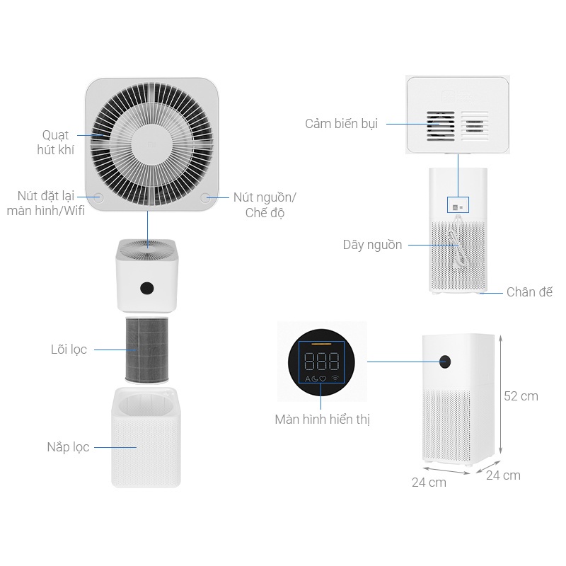 -Màn hình: Led hiển thị ( Nhiệt độ, độ ẩm, chỉ số bụi, Wifi, Chế độ lọc, màu sắc chất lượng không khí)