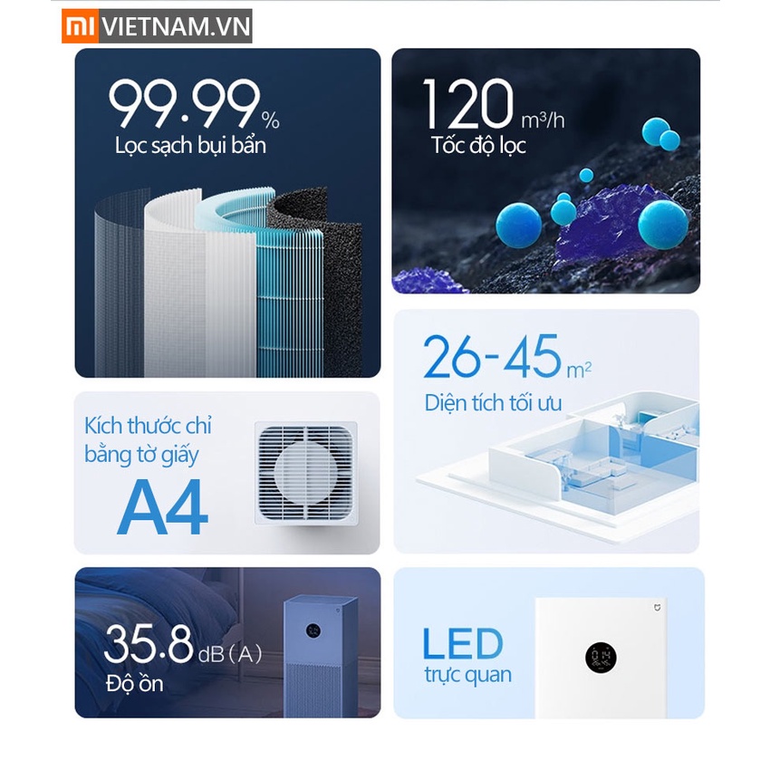 Máy có 4 lớp lọc, loại bỏ nhanh chóng các hạt bụi, tóc, các hạt mịn, lông thú cưng,..Bộ lọc cho hiệu quả lên đến 99.99% các hạt PM2.5 có đường kính lớn hơn hoặc bằng 0.3μm và các mầm bệnh như vi khuẩn, virus, các chất gây dị ứng. Máy còn hấp thụ được các chất độc như formaldehyde, hợp chất hữu cơ dễ bay hơi và các khí độc hại trong không khí, Mijia Air Purifier 4 Lite còn dược hãng giới thiệu là có thể loại bỏ được cả mùi hôi.