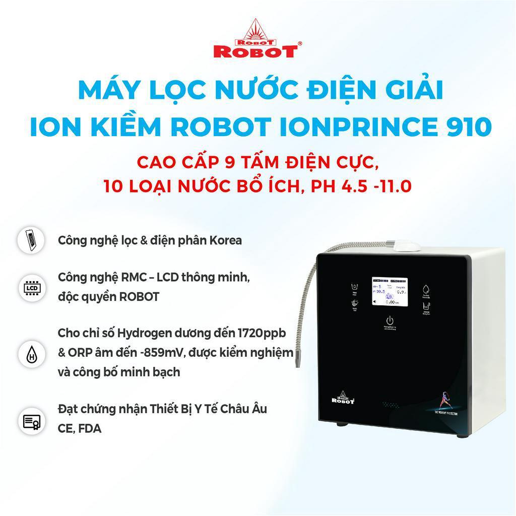 Máy Lọc Nước Điện Giải Ion Kiềm ROBOT IonPrince 910Máy lọc nước điện giải iON kiềm ROBOT ionPrince 910 là sản phẩm được sản xuất với công nghệ tiên tiến, cao cấp trang bị đến 9 tấm điện cực lớn nhất, có khả năng tạo ra đến 10 loại nước đa chức năng: