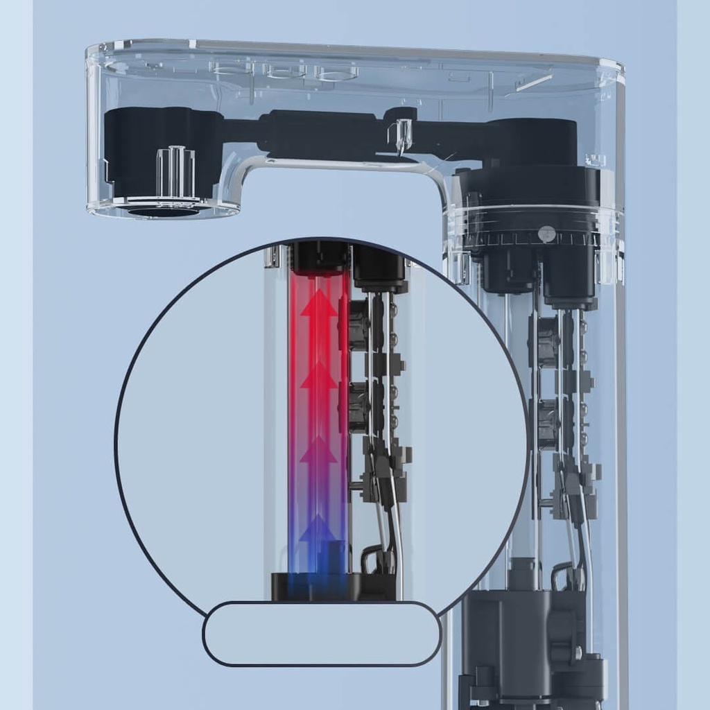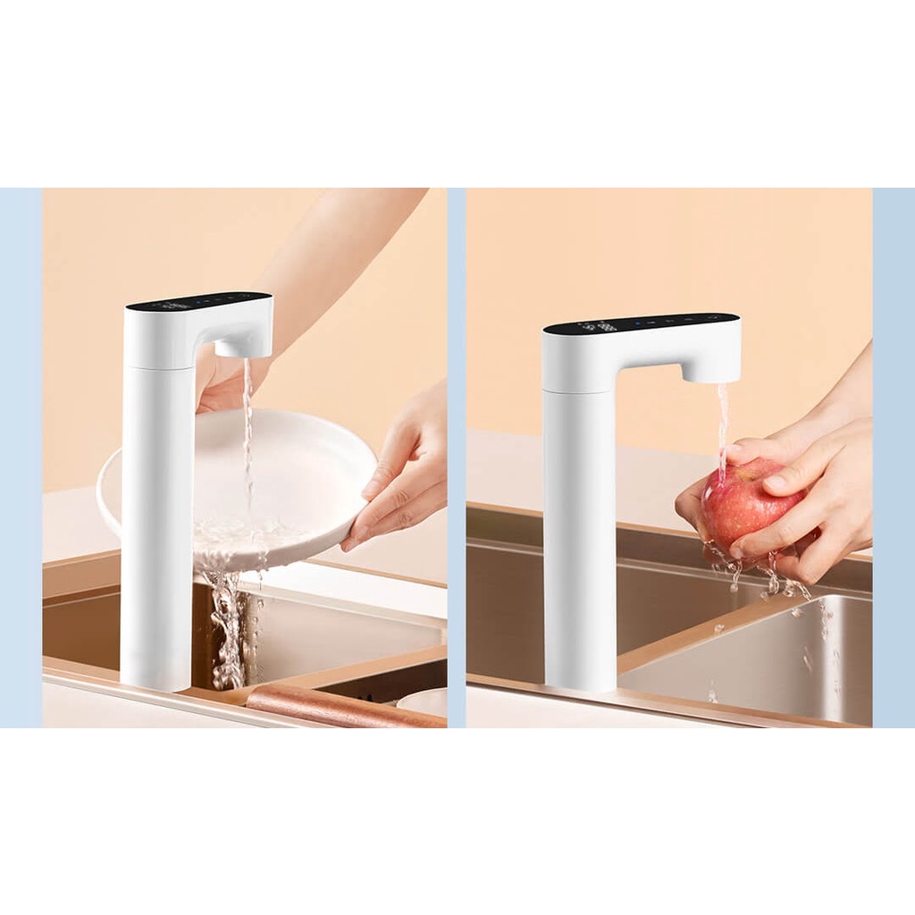 Vòi nước áp dụng cấu trúc đường ống đôi, có thể tách biệt giữa nước bình thường và nước nóng để người dùng thuận tiện lựa chọn theo từng nhu cầu. Thiết kế bảng điều khiển cảm ứng trên vòi, giúp hiển thị rõ ràng nhiệt độ nước, lượng nước và giá trị TDS.
