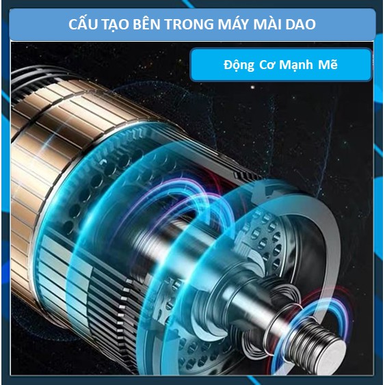 • Máy được hoạt động bởi động cơ nhỏ gọn bên trong nhưng công suất đủ khỏe để xoay đá khi mài. Bộ phận mài được lắp viên đá mài chuyên dụng, vị trí để đưa dao và đặt dao vào mài được thiết kế độ nghiêng thích hợp để đá mài tiếp xúc và mài được sắc lưỡi dao, ngoài ra nhà sản xuất còn tính đến độ an toàn trong quá trình mài nên thiết kế phần nắp nhựa trong dễ quan sát tránh tiếp xúc khi mài và tránh các tia lửa, bụi mài phát ra nên sản phẩm vừa đảm bảo được công năng, an toàn và thẩm mỹ.