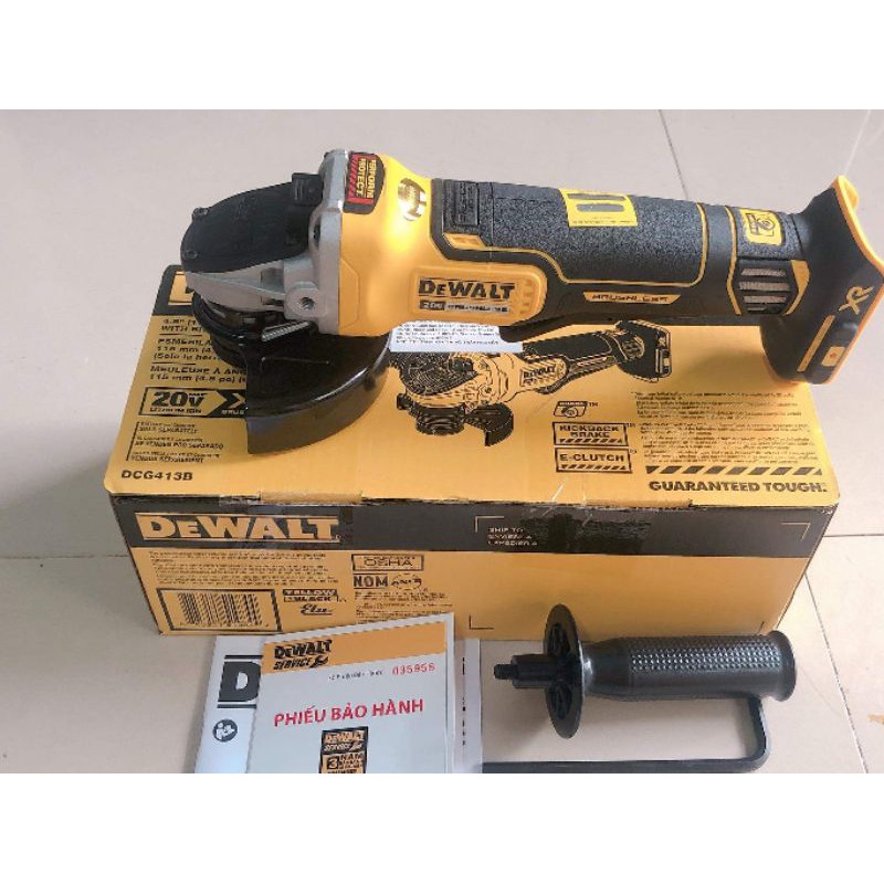 Máy mài Dewalt DCG413 không than nhập Mỹ mới 100% nguyên hộp có các thông số kỹ thuật như sau: - DEWALT Động cơ không chổi than: cung cấp thời gian chạy nhiều hơn tới 57% so với chải Không có tốc độ tải: tối đa 9, 000 RPM - Phanh lưỡi: phanh tham gia khi công tắc mái chèo được giải phóng, nhanh chóng dừng bánh xe - Điện áp pin ban đầu tối đa (đo mà không có khối lượng công việc) là 20 volt. Điện áp danh định là 18.