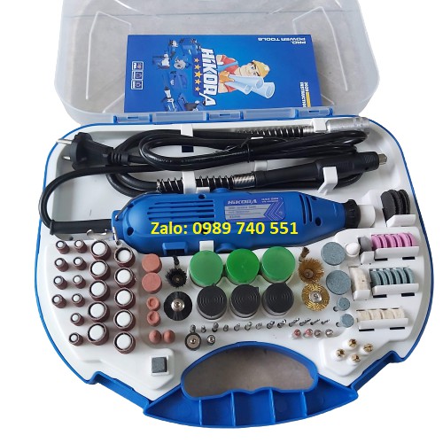 Bộ phụ kiện đầy đủ :máy mài, nhám, đánh bóng, đầu kẹp, khắc, khoan,...