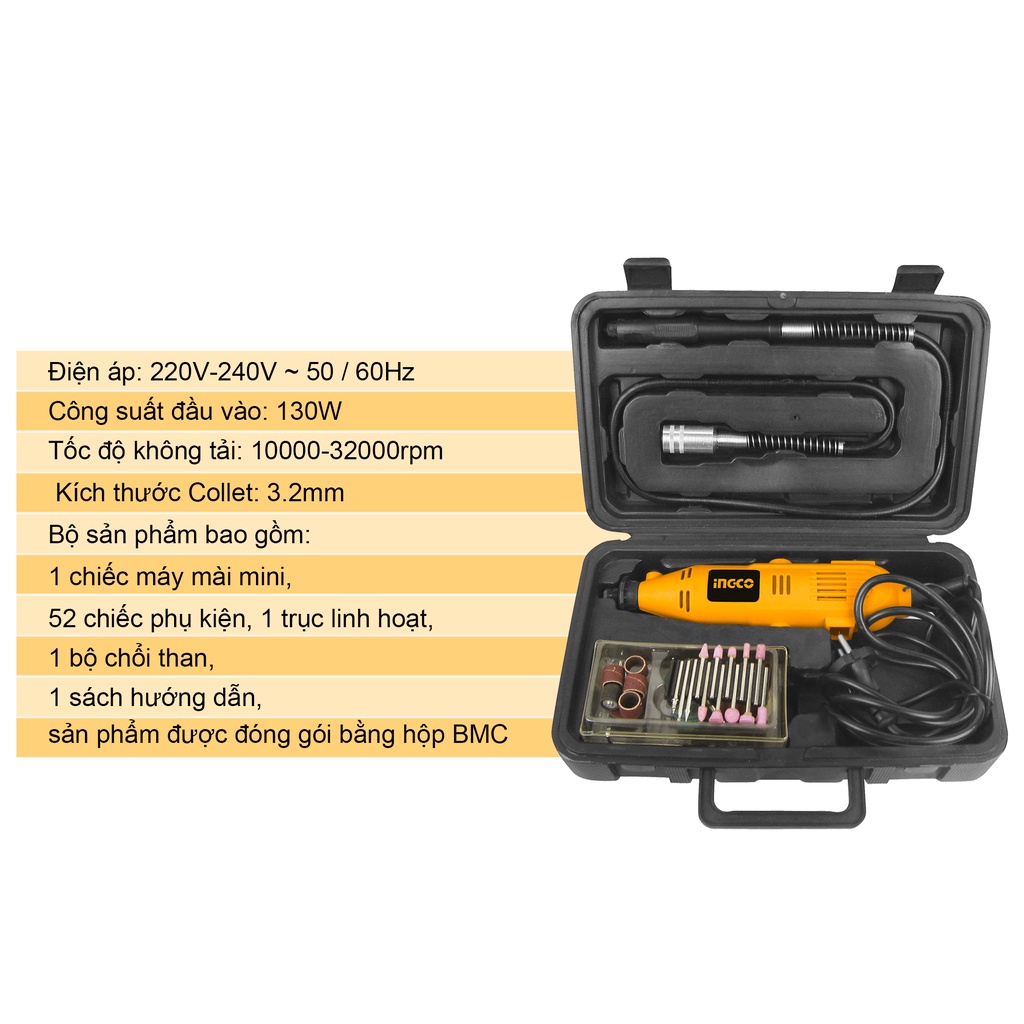 Máy mài mini INGCO MG1309 là phiên bản cải tiến của MG1308 có 52 phụ điện kèm theo, giúp đáp ứng cho nhu cầu khoan, mài, cắt, đánh bóng... trên nhiều chất liệu khác nhau như thép, gỗ, kính, gốm, sứ...Thông số kỹ thuật: