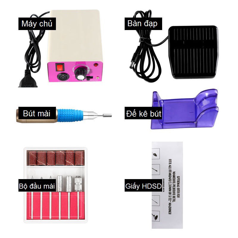 - Được tặng 6 đầu mài chà nhám thép khác nhau, 3 loại thô nhám, 3 loại mịn với chức năng khác nhau (loại bỏ da chết quang móng, mài sơn gel, mài mịn, viền cạnh,...)