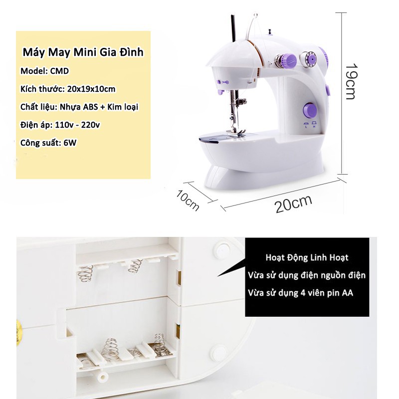 • Máy may mini gia đình cầm tay tiện dụng có kích thước vô cùng nhỏ gọn và trọng lượng nhẹ nhưng vẫn có thể giúp bạn may vá hay sửa chữa lại quần áo một cách dễ dàng như những chiếc bàn máy may chuyên nghiệp. Sản phẩm còn được sản xuất từ chất liệu cao cấp nên có độ bền cao giúp bạn yên tâm sử dụng lâu dài.