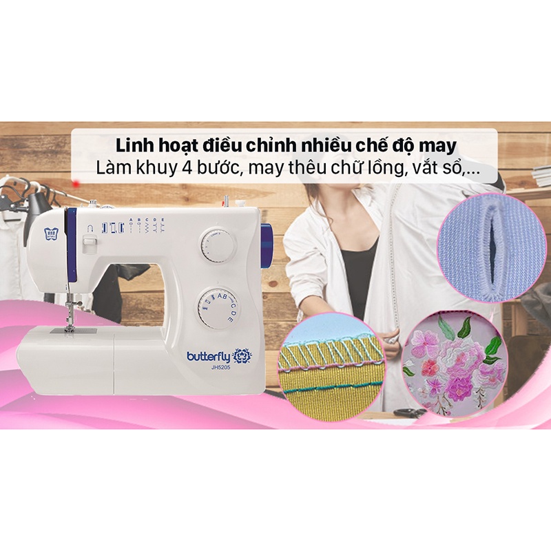 Thiết Bị Điện Gia Dụng > Thiết bị điện gia dụng nhỏ > Máy may & Phụ kiện || Máy May Gia Đình Cơ Bản Butterfly JH5205 Nhỏ Gọn thiết kế hiện đại với 5 đường may có sẵn + làm khuy 4 bướcCòn hàng