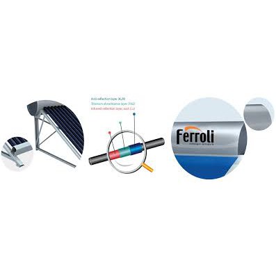 3 LỚP ỐNG - Lớp chống phản quang (AI) - Lớp hấp thụ nhiệt Titanium (TiO2) - Lớp truyền nhiệt: Đồng (CU) ống thủy tinh thu nhiệt chân không làm bằng thủy tinh chịu nhiệt trong suốt, siêu bền, có thể chịu được mưa đá, cho phép giữ nhiệt lên tới 72h. ống hấp thụ nhiệt Ferroli có thể hấp thụ năng lượng của tia hồng ngoại, nên trong những ngày nhiều mây và không có nắng vẫn có thể dùng nước nóng.