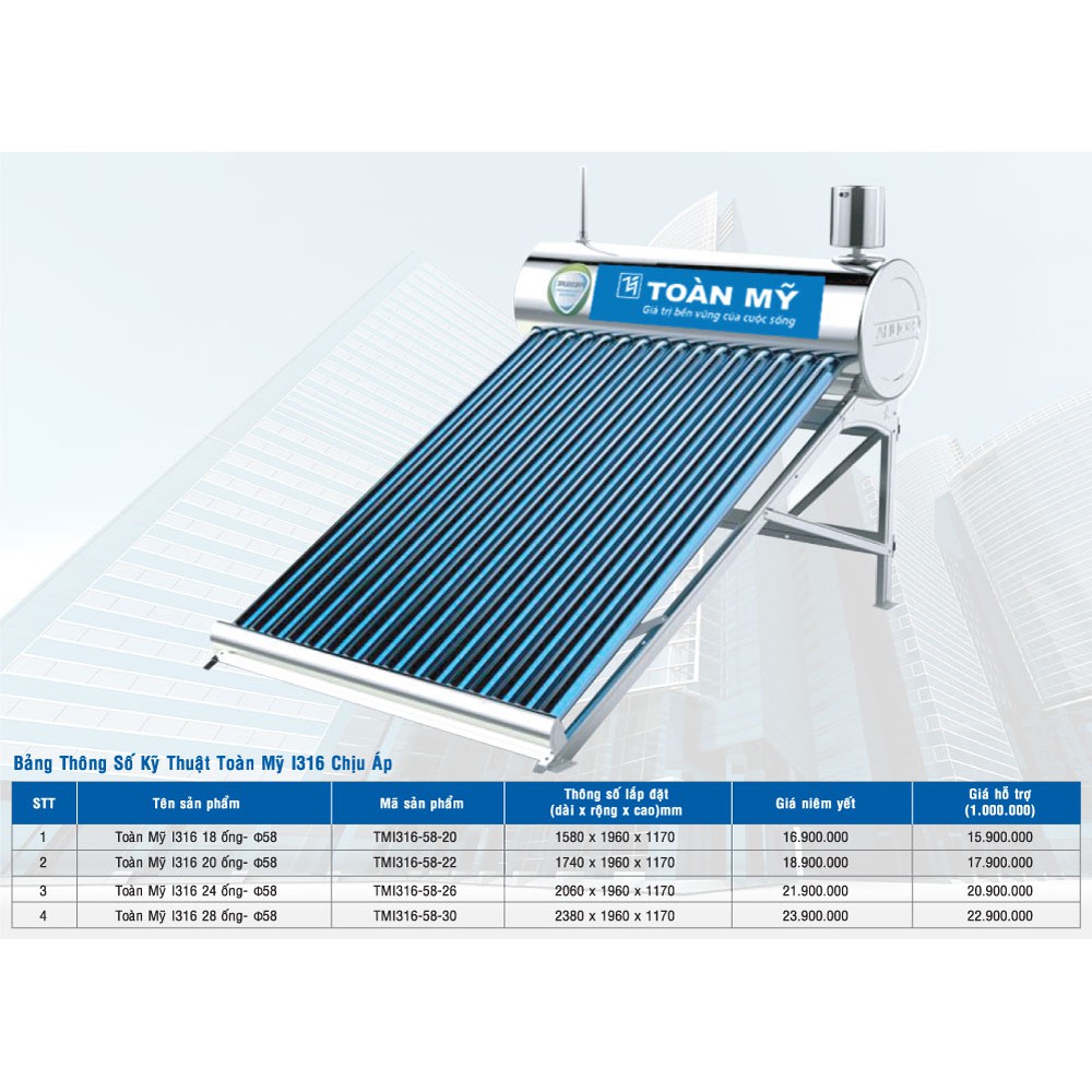 Đặc tính:Máy nước nóng năng lượng mặt trời I316 , có 18 ống – Ø 58 Toàn Mỹ là dòng máy chịu áp đầu tiên trên thị trường