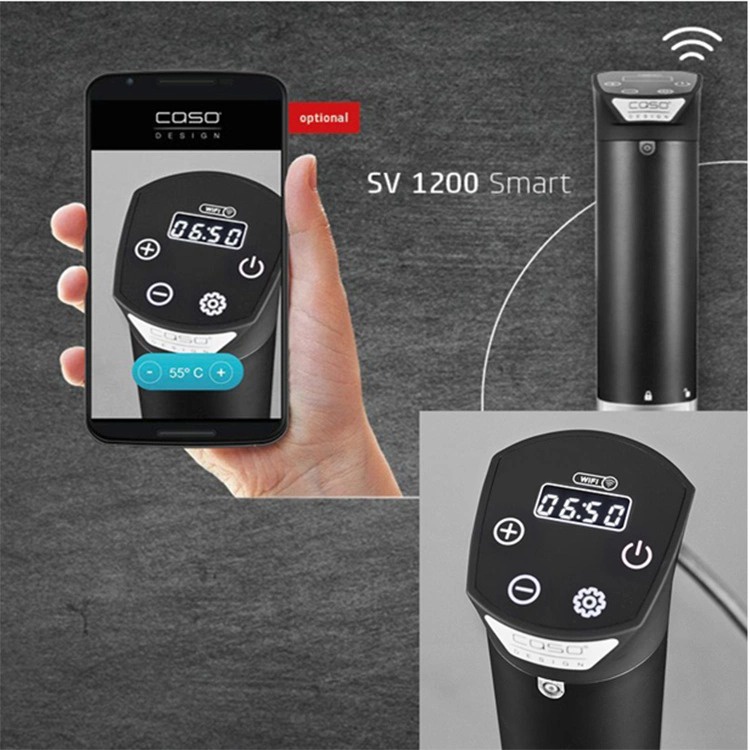 Máy nấu chậm Sous Vide Caso SV 1200 được trang bị một bảng điều khiển bằng cảm ứng vô cùng thông minh hiển thị LED trực quan và sắc nét. Đặc biệt, sản phẩm máy nâud chậm này còn được trang bị thêm công nghệ kết nối thông qua ứng dụng Caso Control cho phép người dùng có thể giám sát và điều khiển từ xa. Điểm đặc biệt này bạn sẽ không dễ bắt gặp ở những dòng máy nấu chậm thông thường. Với sản phẩm này bạn sẽ không phải trực tiếp thay đổi các thao tác mà có thể thực hiện gián tiếp thông qua kết nối từ điện thoại.
