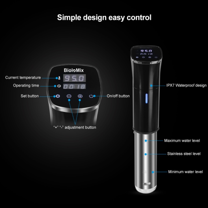 – Chỉ cần gắn nồi vào bất kỳ nồi nào, thêm nước, cho các nguyên liệu của bạn vào túi hút chân không. Bắt đầu nấu chỉ với một nút bấm trên thiết bị. Chế độ hẹn giờ và kiểm soát nhiệt độ của nồi Sous vide cho phép bạn thư giãn trong khi nấu ăn, các phần tiếp xúc nước bằng thép không gỉ có thể tháo rời của bếp sous vide an toàn và vệ sinh dễ dàng, thiết bị nhà bếp này dễ dàng vệ sinh và bảo trì.