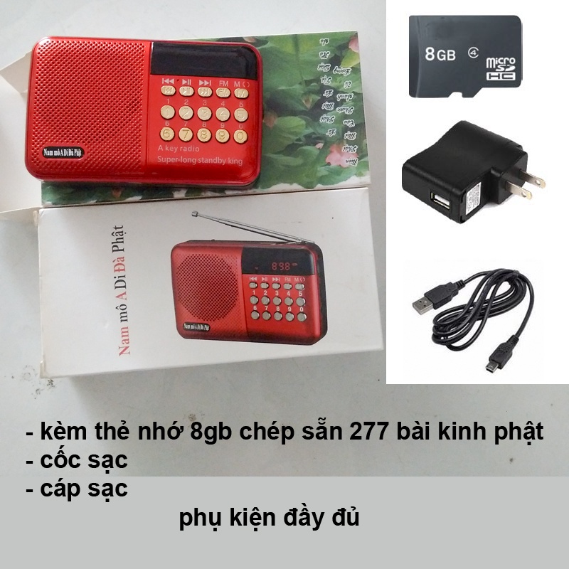 - 1 bộ đầy đủ: thân máy + cáp sạc + cốc sạc + pin sạc + kèm thẻ nhớ 8gb đã chép sẵn 277 bài kinh phật ( quý khách không thích thì về chép nhạc vào thẻ nhớ tùy ý )