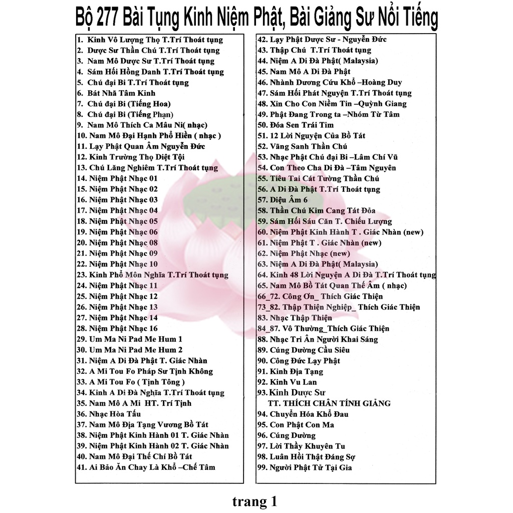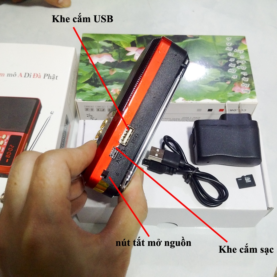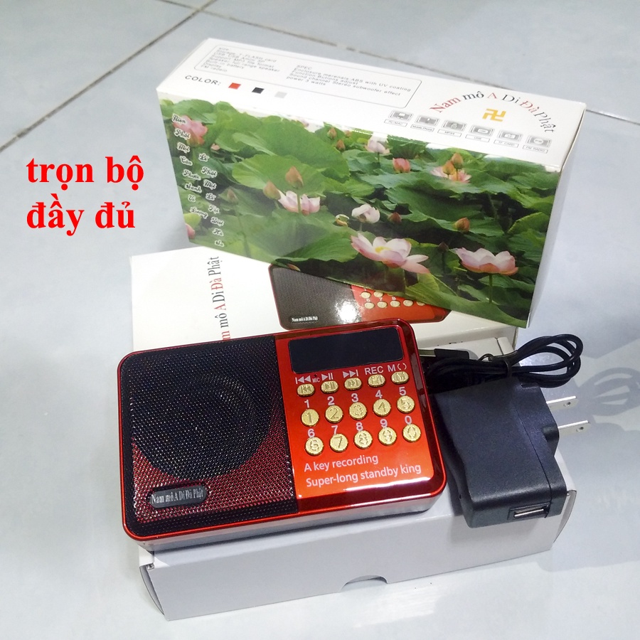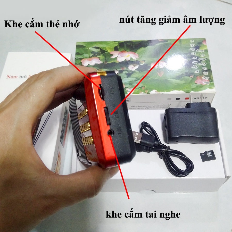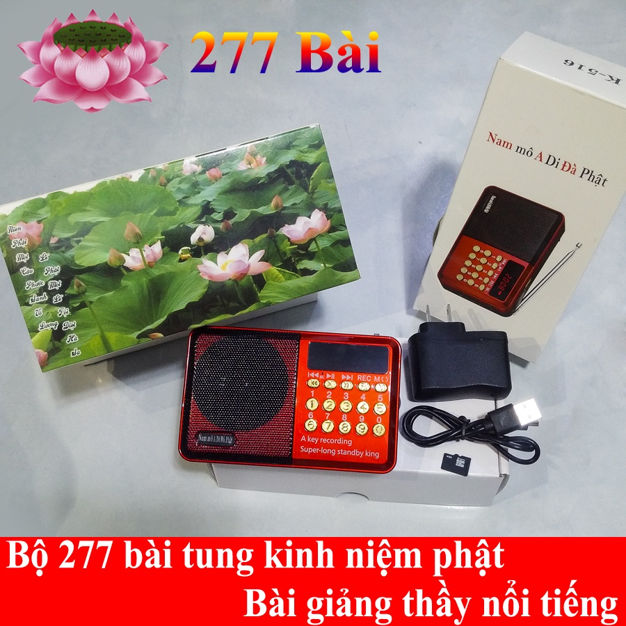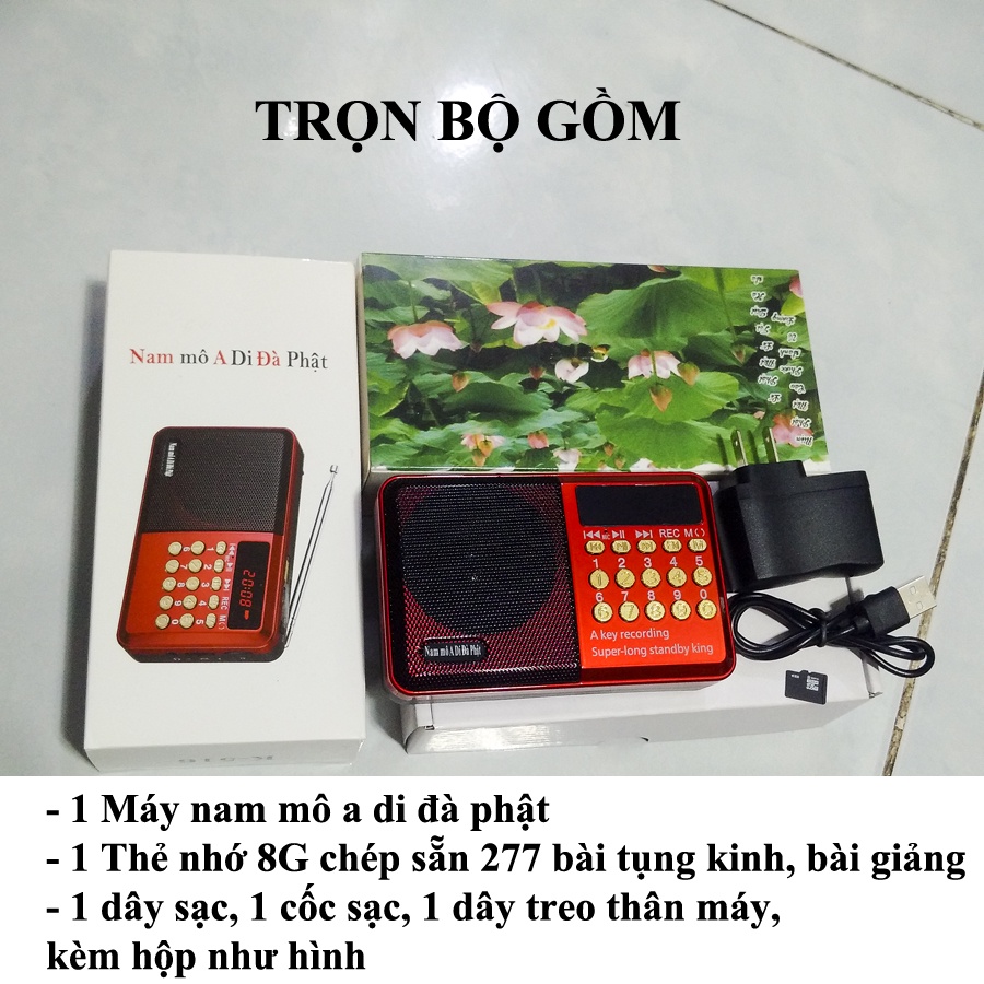 - Bộ gồm đầy đủ: thân máy, cáp sạc, cốc sạc, thẻ nhớ 8gb chép sẵn kinh phật, in danh sách 277 bài kinh phật