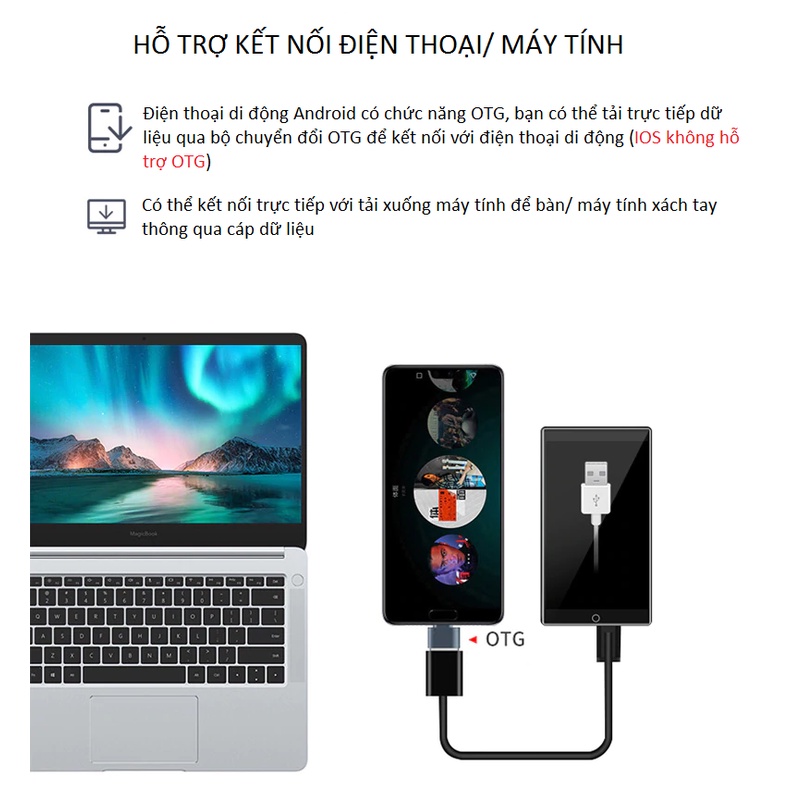 - Ruizu D20/H1 hỗ trợ kết nối OTG, có thể kết nối và lấy nhạc trực tiếp từ các loại smartphone sử dụng hệ điều hành Android