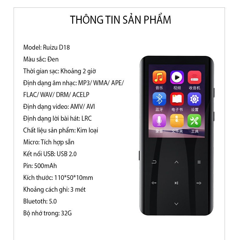 Máy Nghe Nhạc MP3 Màn Hình Cảm Ứng Bluetooth Ruizu D18 Bộ Nhớ Trong 32GB - Hàng Chính HãngThông tin sản phẩm: