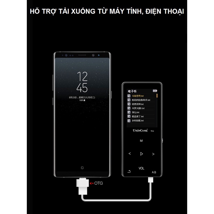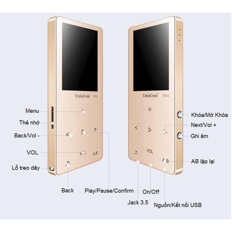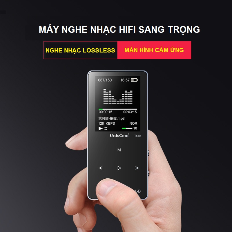 - Máy nghe nhạc HI-FI lossless UnisCom T510 có bộ nhớ trong 8GB và hỗ trợ thẻ nhớ mở rộng Micro SD 64GB;