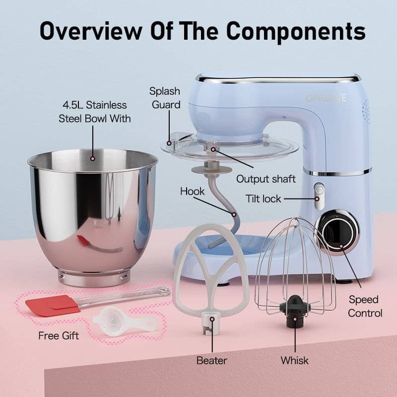 ✔️Máy nhào bột OPRULVE 4.5L 1300W gồm 3 đầu phụ kiện chính là móc câu để trộn bột, đầu trộn salad làm chả giò, lồng đánh trứng được làm bằng kim loại die-cast aluminum cao cấp. Ngoài ra mỗi máy còn được trang bị 1 nắp trong suốt và 1 phới silicon cao cấp.
