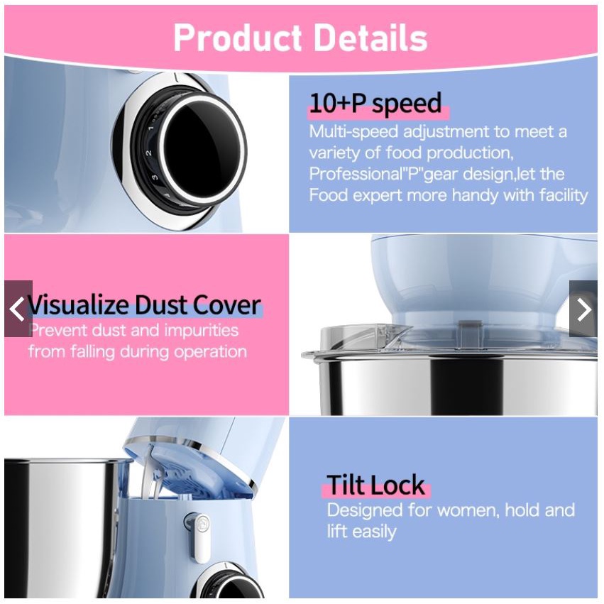 ✔️Máy nhào bột OPRULVE 4.5L 1300W gồm có 10 tốc độ tương ứng với 3 chức năng: Trộn bột, trộn thực phẩm, đánh kem đánh trứng. Đi kèm với máy là 3 đầu đánh:Tốc độ 1-4 được sử dụng với phụ kiện móc câu để nhào trộn bột nặng như bột bánh mỳ hoa cúc, bột bánh bao; Tốc độ 2-6 được sử dụng với phới trộn tam giác để trộn salad, làm ruốc, chả giò,; Tốc độ 8-10 được sử dụng với lồng đánh trứng để đánh kem, đánh trứng, làm bánh bông lan,