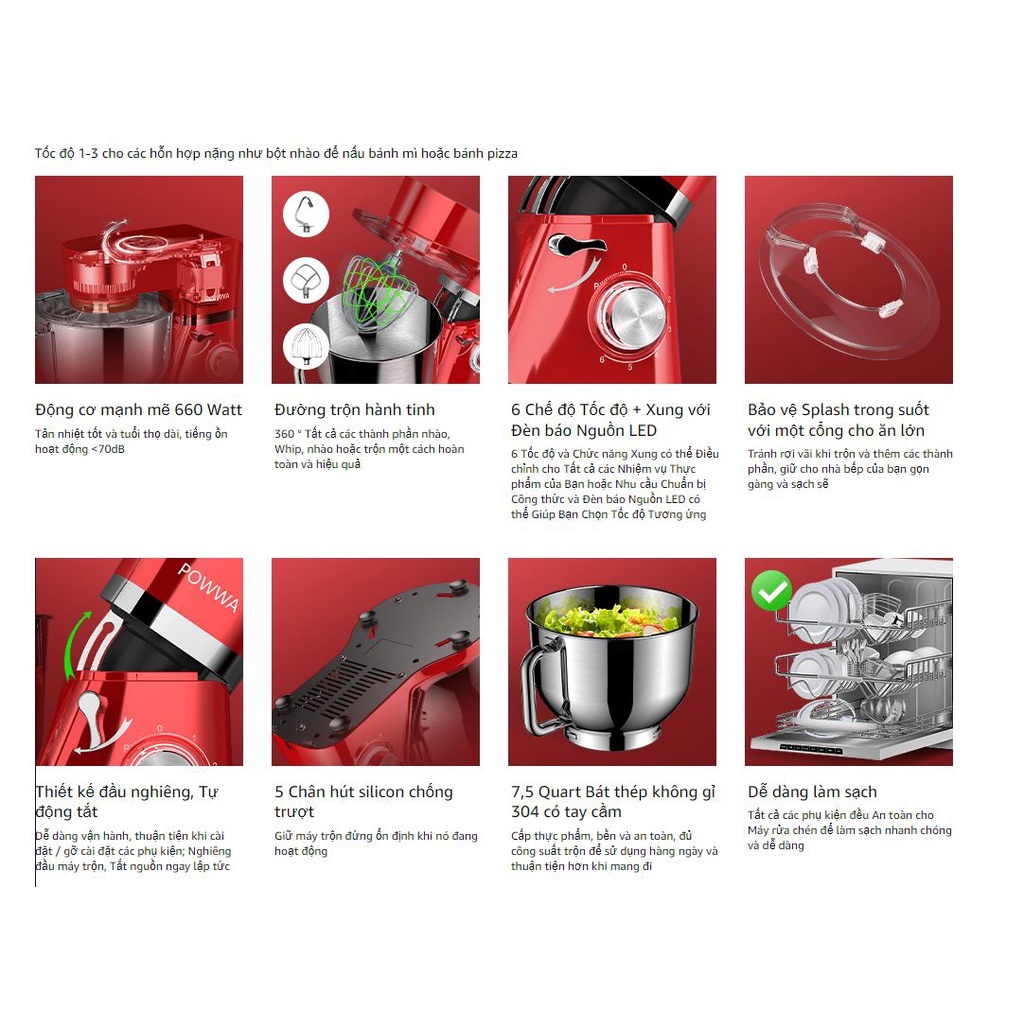 Thiết Bị Điện Gia Dụng > Đồ gia dụng nhà bếp > Máy trộn thực phẩm || Máy nhào bột POWWA 6.5L 1500W - trộn 1.2 kg bột khô - Đánh kem, đánh trứng, trà bông - Hàng chính hãng ANH QUỐCCòn hàng