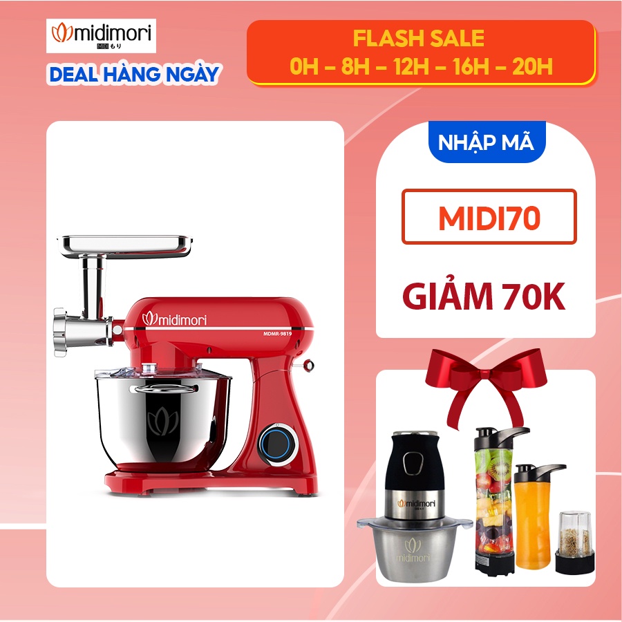 Giới thiệu [Mã ELHADEV giảm 4% đơn 300K] Máy nhào trộn bột, xay thịt đùn xúc xích Midimori 1800W, thân khung thép, cối inox 6 lít