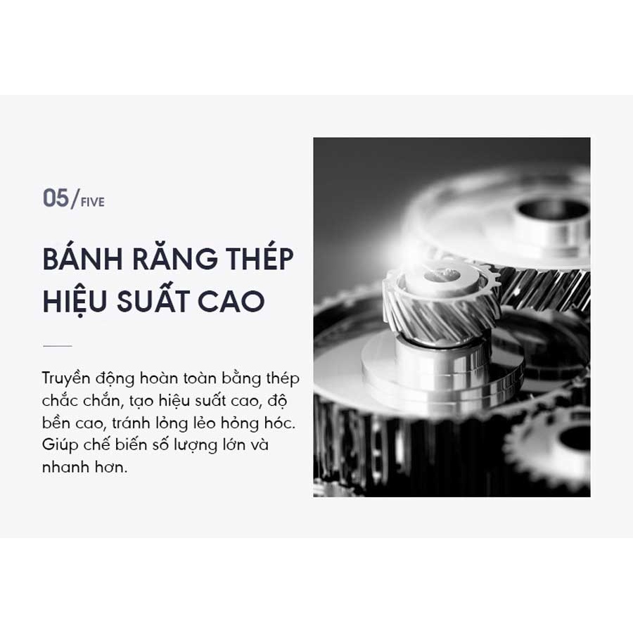 Cối trộn lớn (thiết kế tay cầm tiện lợi) có dung tích 6 lít được làm bằng chất liệu inox 304 không gỉ, bền bỉ, khả năng chịu lực tốt mang lại sự mạnh mẽ và chắc chắn tuyệt vời, gắn trên phần thân máy được làm từ khung thép giúp quá trình nhồi bột của bạn được vận hành một cách êm ái, không rung lắc và giảm thiểu tối đa tiếng ồn khi hoạt động. Nó có thể trộn tới 23 lòng trắng trứng, 9 pound khoai tây nghiền hoặc 14 bánh quy Dozen cùng một lúc hoặc trộn tới 1,5 kg bột.