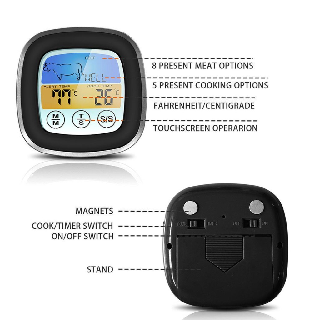 - Nhạy cảm khi chạm và dễ đọc nhiệt độ ngay cả trong điều kiện ánh sáng mờ để bạn có thể thưởng thức tiệc nướng BBQ vào ban đêm. Có thể chuyển đổi độ °C hoặc °F.