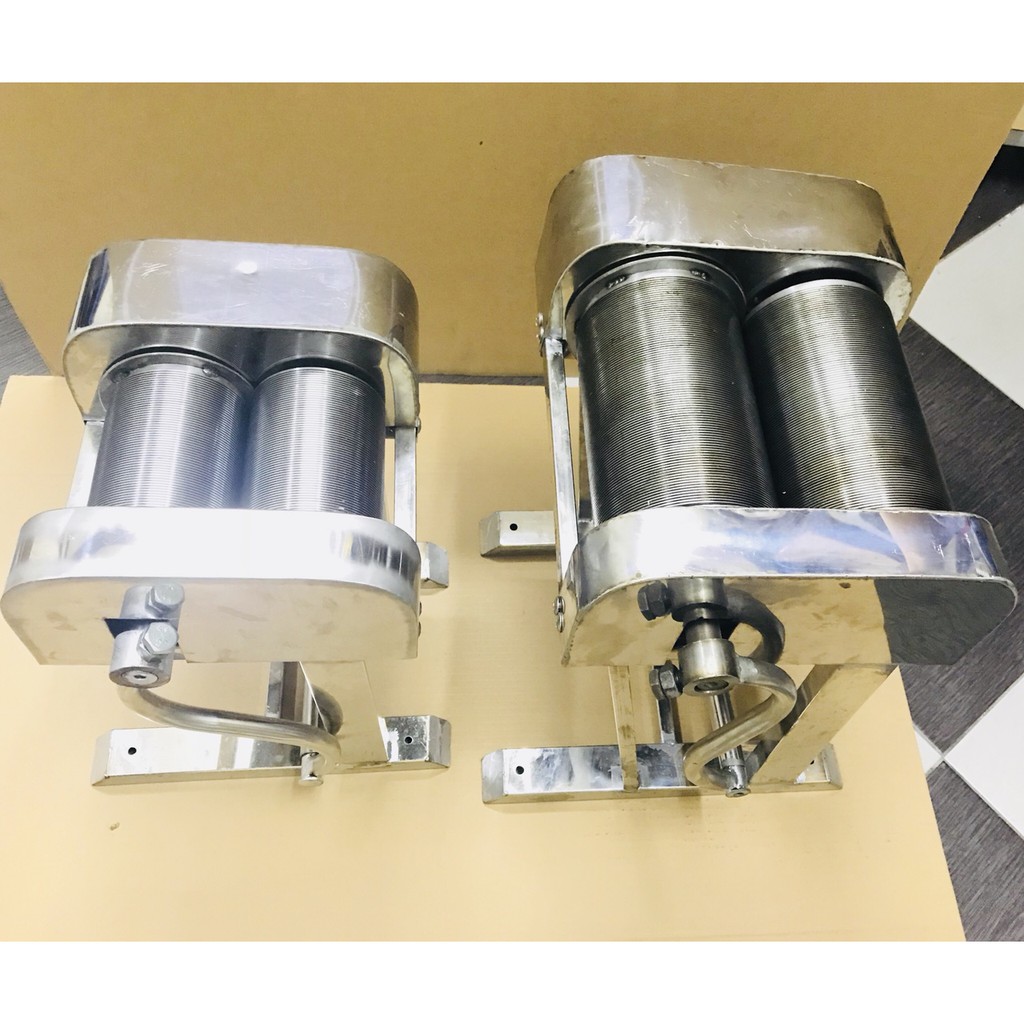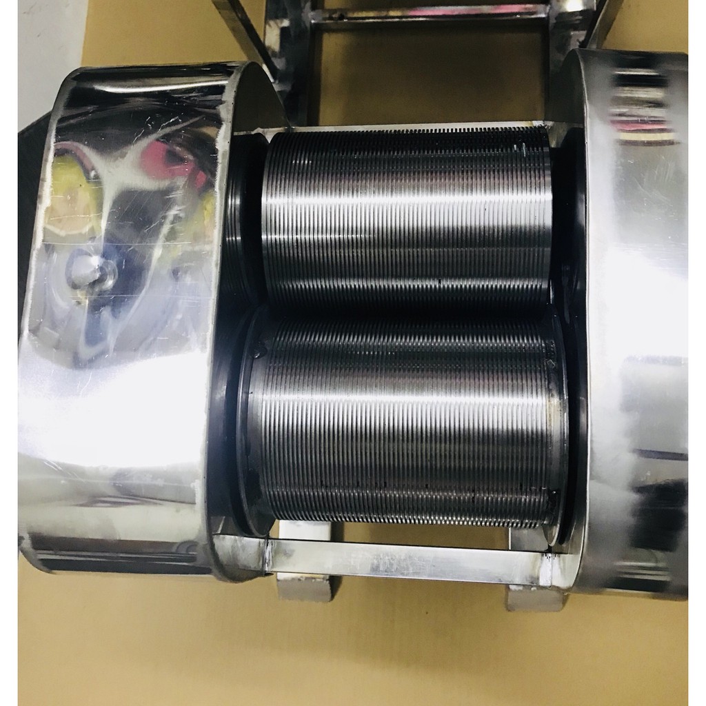 Bộ trục cuốn và dao cắt bằng thép, có bề rộng 1 trục 6cm, bề dài trục 12cm.