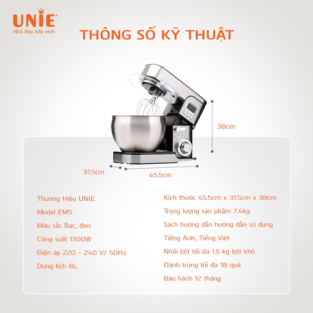 Thiết Bị Điện Gia Dụng > Đồ gia dụng nhà bếp > Máy trộn thực phẩm || Máy nhồi, trộn bột đa năng Unie EM5 (Bản nâng cấp) Dung tích 8L - Hàng chính hãngCòn hàng