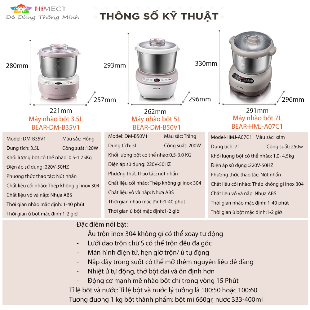 Máy Nhồi Trộn Bột Tự Động Bear Đa Năng Trộn Nhồi Ủ Bột Tự Động Dung Tích 3.5L, 5L, 7L- HimectTHÔNG TIN SẢN PHẨM