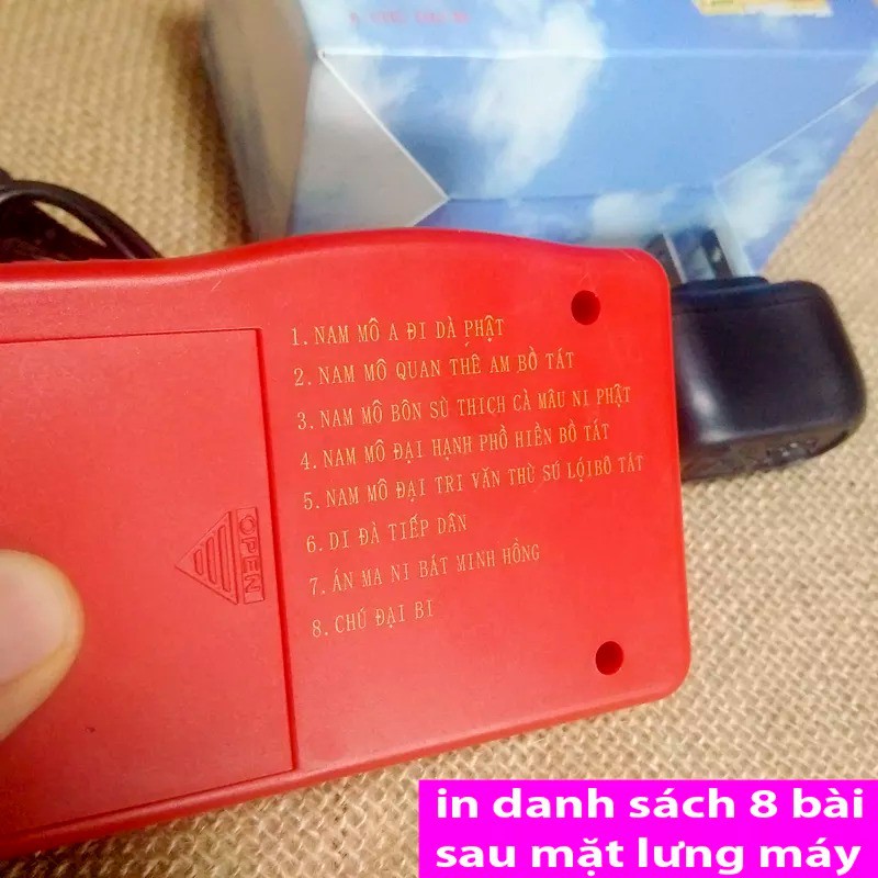 Mô tả sản phẩm Máy Tụng Kinh Niệm Phật 8 Bài kèm cục nguồn, để bàn thờ tụng cả ngàyMáy chuyên tụng kinh niệm phật gồm 8 bài có sẵn