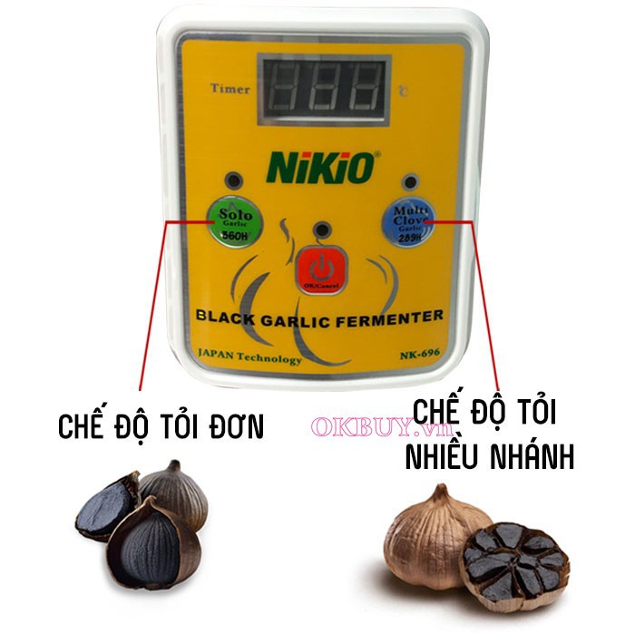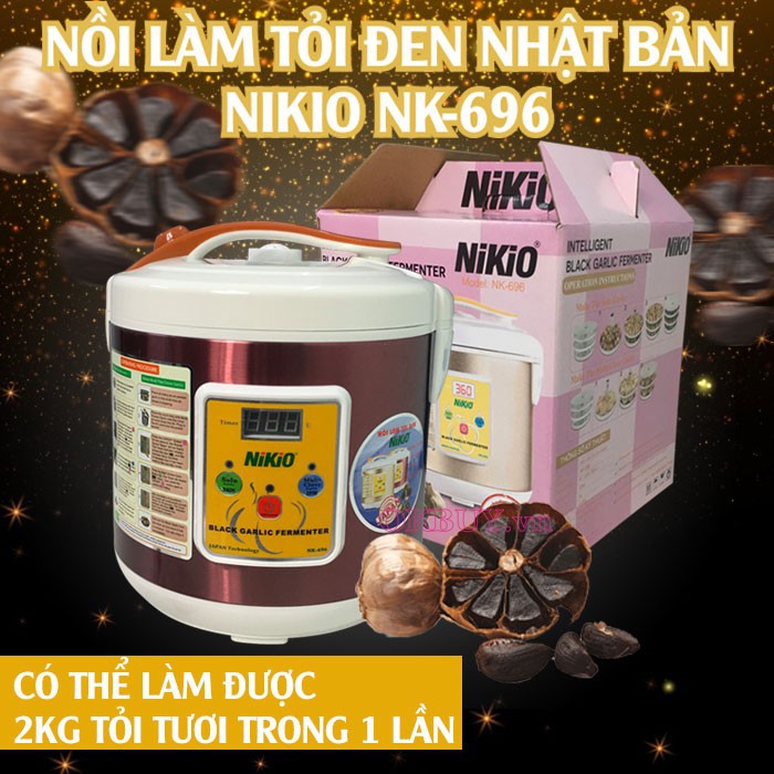 MÁY LÀM TỎI ĐEN NHẬT BẢN NIKIO NK696 CAO CẤPTỏi đen trên thị trường có giá rất đắc từ 1.5 triệu đến 3 triệu tùy thuộc vào loại tỏi nhiều nhánh hay tỏi cô đơn và không phải ai cũng có điều kiện để sử dụng. Chính vì thế mà nồi làm tỏi đen gia đình trở thành lựa chọn tối ưu nhất cho người tiêu dùng. Các hãng điện gia dụng đã cho ra đời nhiều dòng sản phẩm máy làm tỏi đen, trong đó nổi bật nhất là nồi làm tỏi đen Nikio NK-696 dòng 6 lít, có 2 màu Vàng Gold và Đỏ Tím. Máy làm tỏi đen cho phép làm tỏi đen tại nhà dễ dàng, đơn giản và tiết kiệm, nồi làm tỏi đen mang lại hiệu quả cao với chất lượng tỏi đúng chuẩn tỏi đen Nhật Bản trên thị trường, nhưng lại tiết kiệm được chi phí đáng kể cho người dùng. Máy làm tỏi đen chính hãng Nikio NK-696 được nhiều người tin dùng bởi chất lượng sản phẩm và tỷ lệ lên men thành công cao, mang đến sự hài lòng tuyệt đối cho người dùng. Chỉ với 1 chiếc nồi làm tỏi đen gia đình này bạn sẽ có những củ tỏi đen thơm nồng, dẻo ngọt và nhiều chất dinh dưỡng. Giúp bồi bỗ sức khỏe và phòng ngừa một số bệnh nguy hiểm tìm ẩn trong cơ thể bạn. Sản phẩm được mệnh danh là ""Vũ Khí"" bảo vệ sức khỏe cho gia đình Bạn.