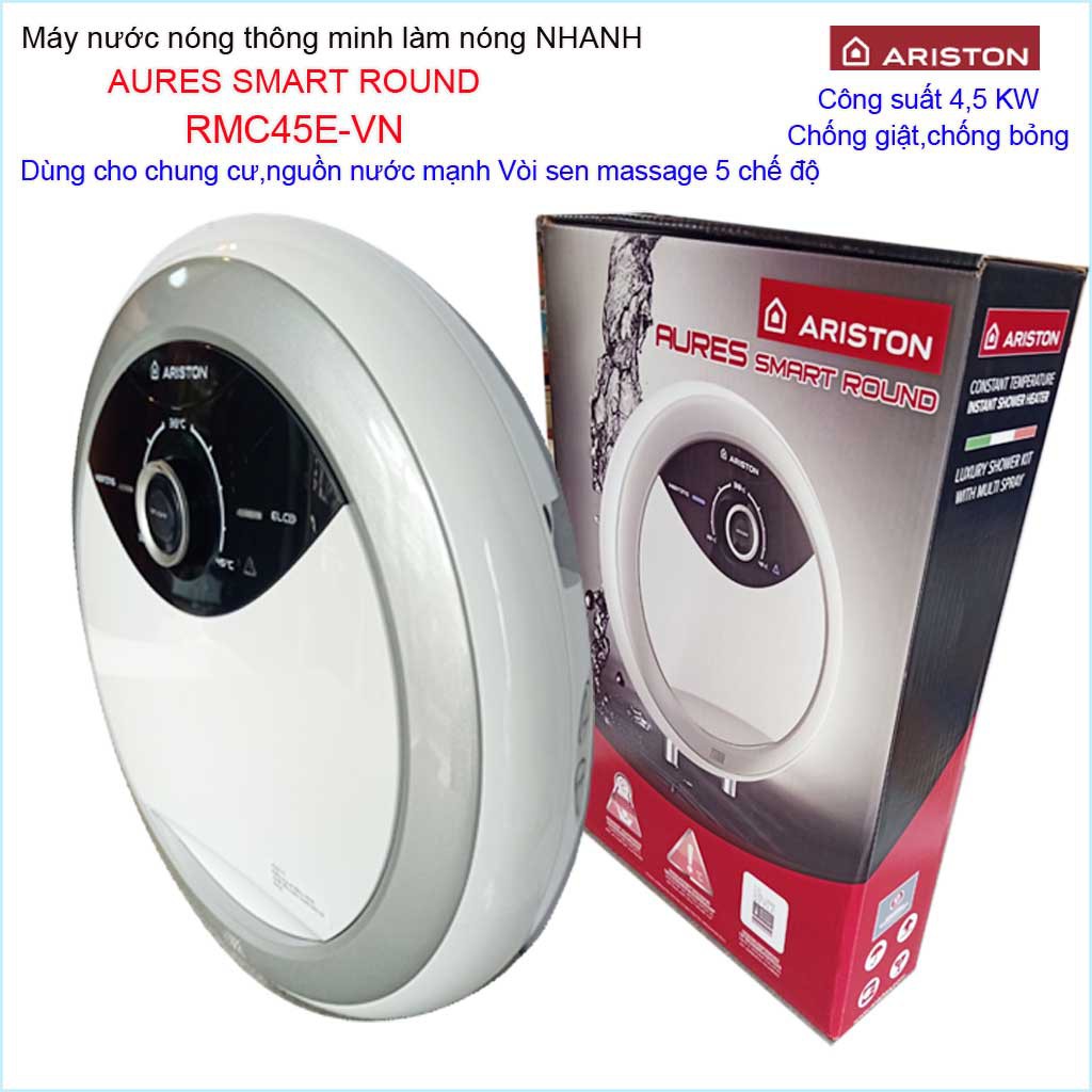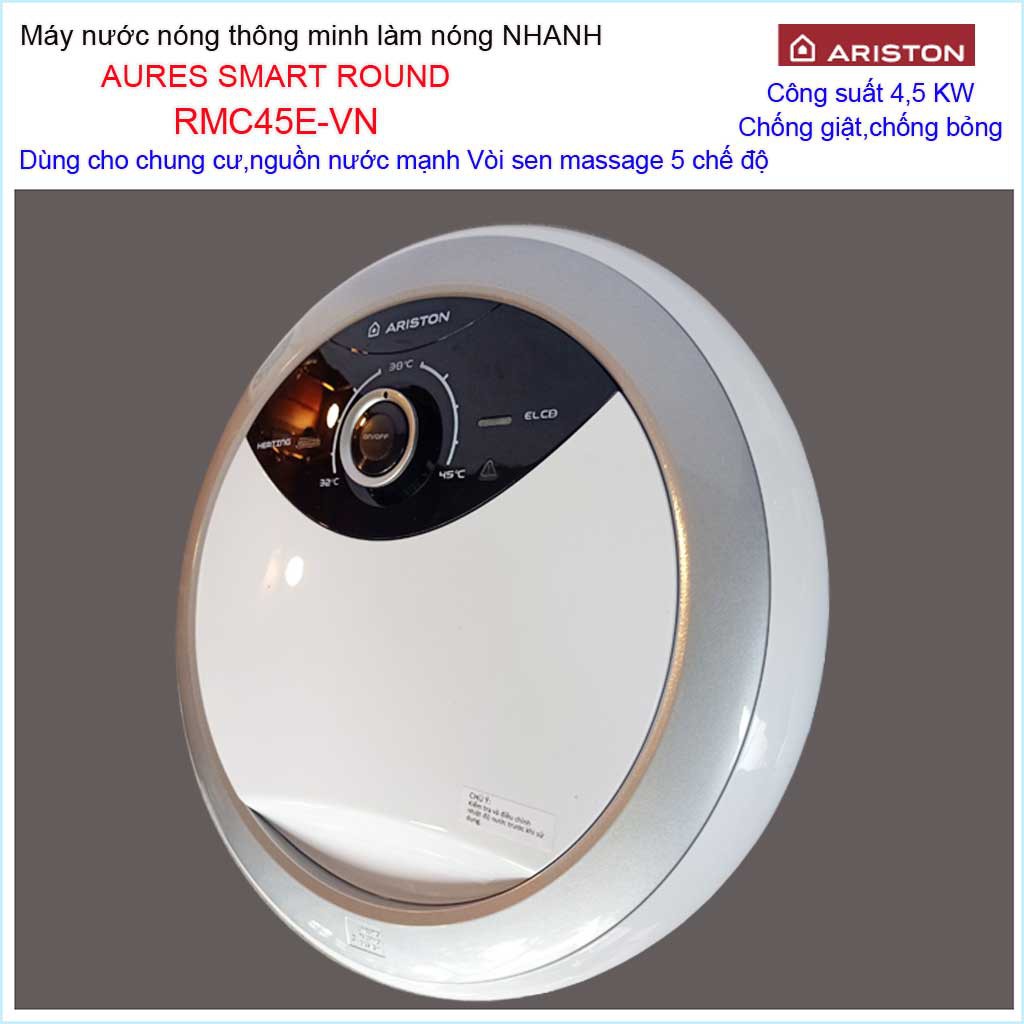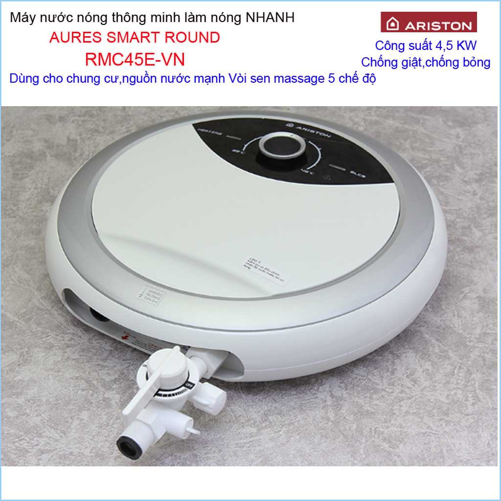 Máy nước nóng Ariston RMC45E-VN, máy nước nóng trực tiếp cho chung cư Aures Smart Round (không bơm)Máy nước nóng Ariston Aures Smart Round thiết kế độc đáo và sang trọng bởi các chuyên gia thiết kế nội thất hàng đầu Italy Umberto Palermo, nhiệt độ luôn ổn định, cầu giao chống giật ELCB với chức năng tự động kiểm tra (Auto Test) ngay khi khởi động máy,
