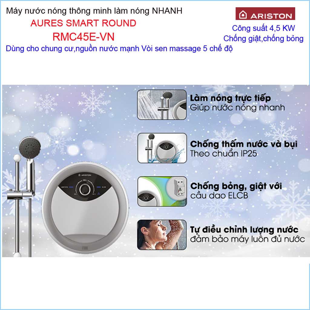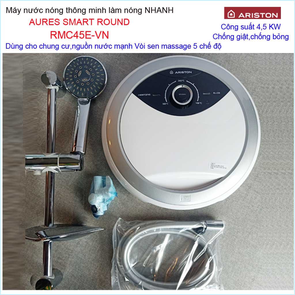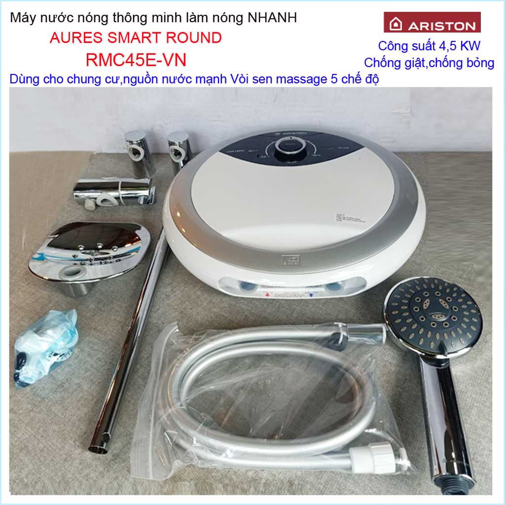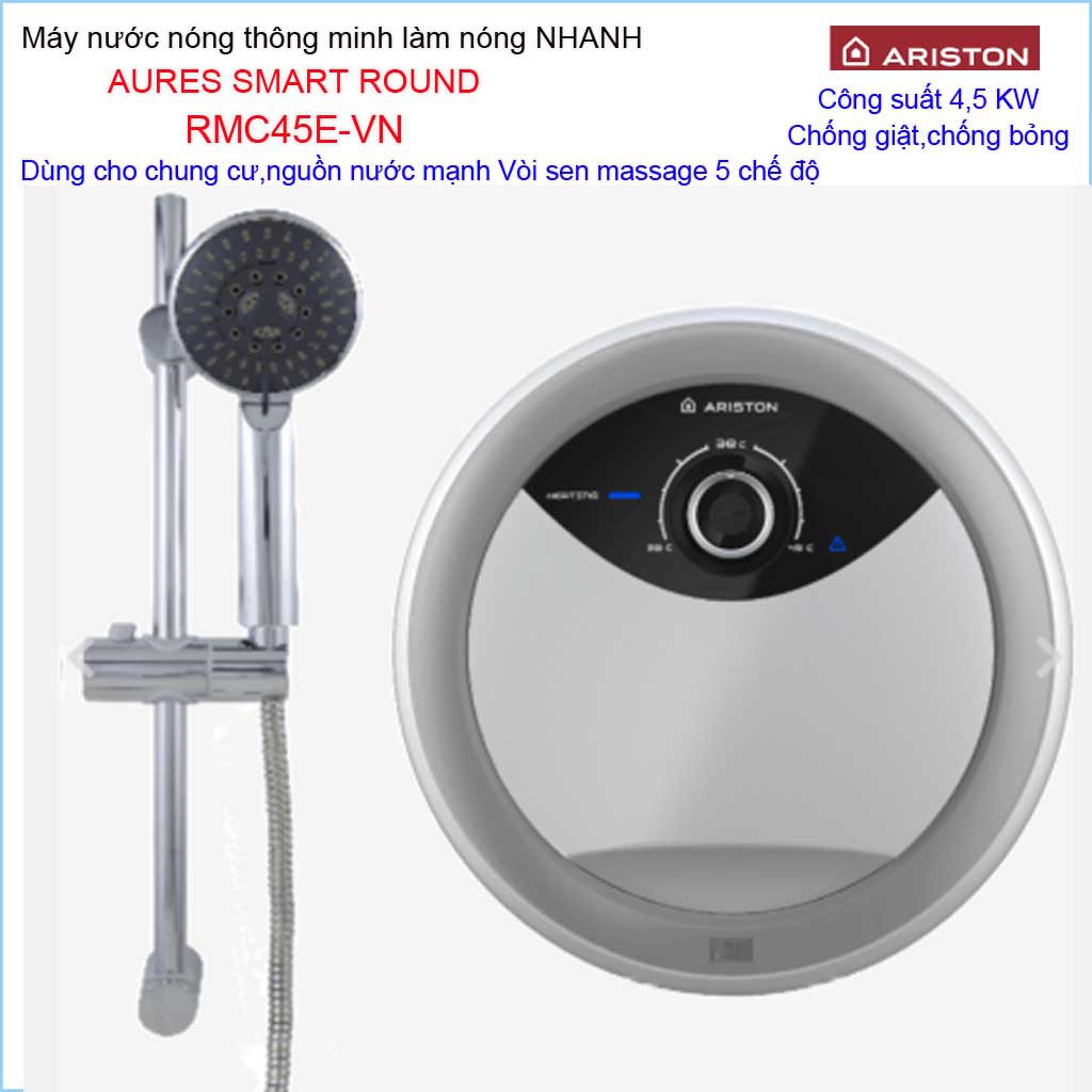 Máy nước nóng Ariston RMC45E-VN, máy nước nóng trực tiếp cho chung cư Aures Smart Round (không bơm)Máy nước nóng Ariston Aures Smart Round thiết kế độc đáo và sang trọng bởi các chuyên gia thiết kế nội thất hàng đầu Italy Umberto Palermo, nhiệt độ luôn ổn định, cầu giao chống giật ELCB với chức năng tự động kiểm tra (Auto Test) ngay khi khởi động máy,