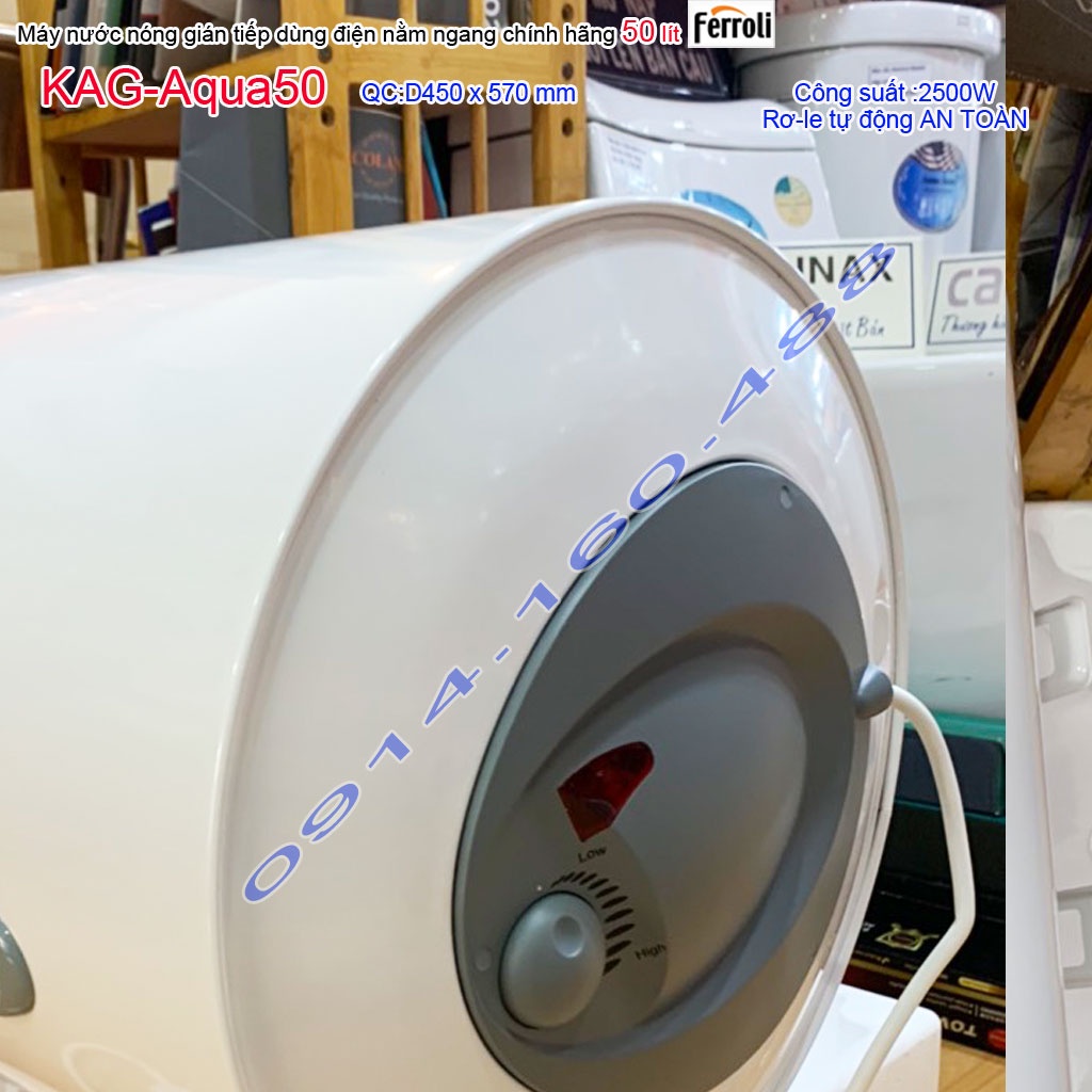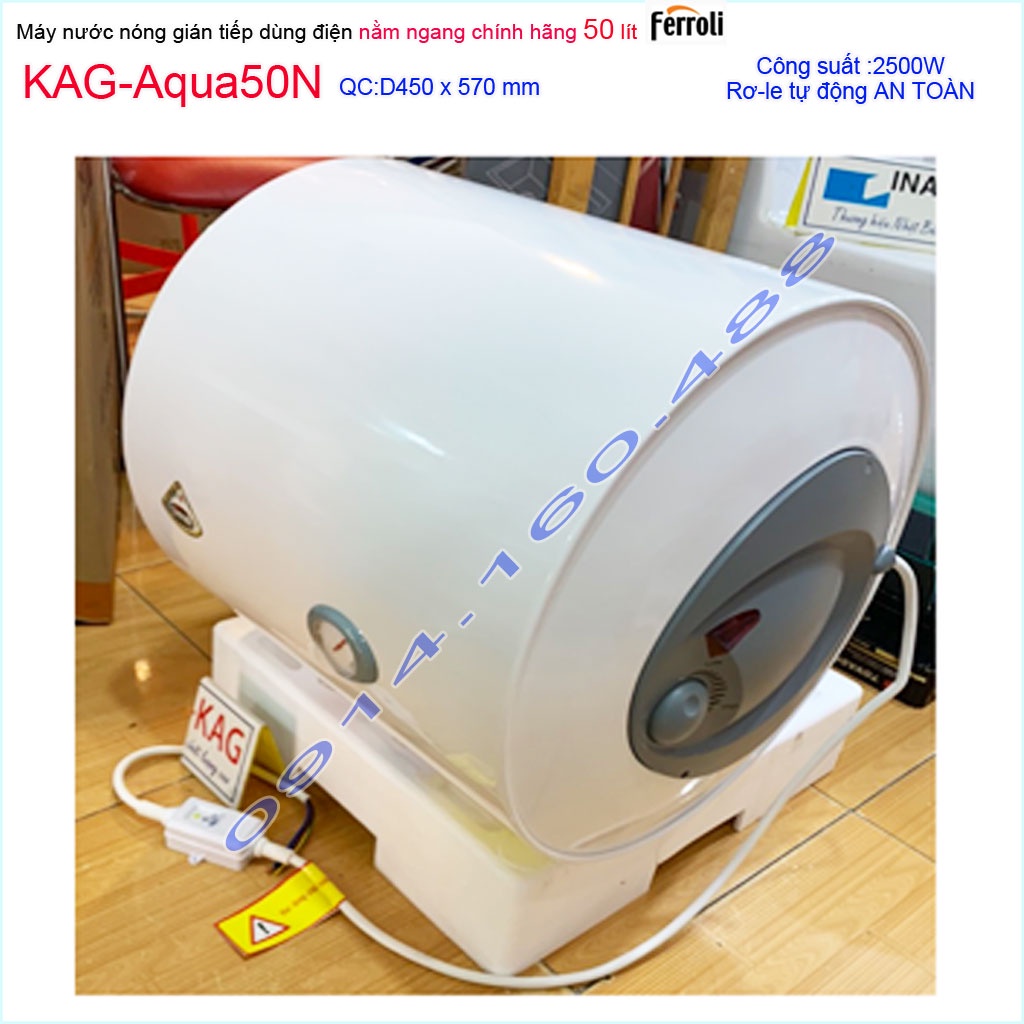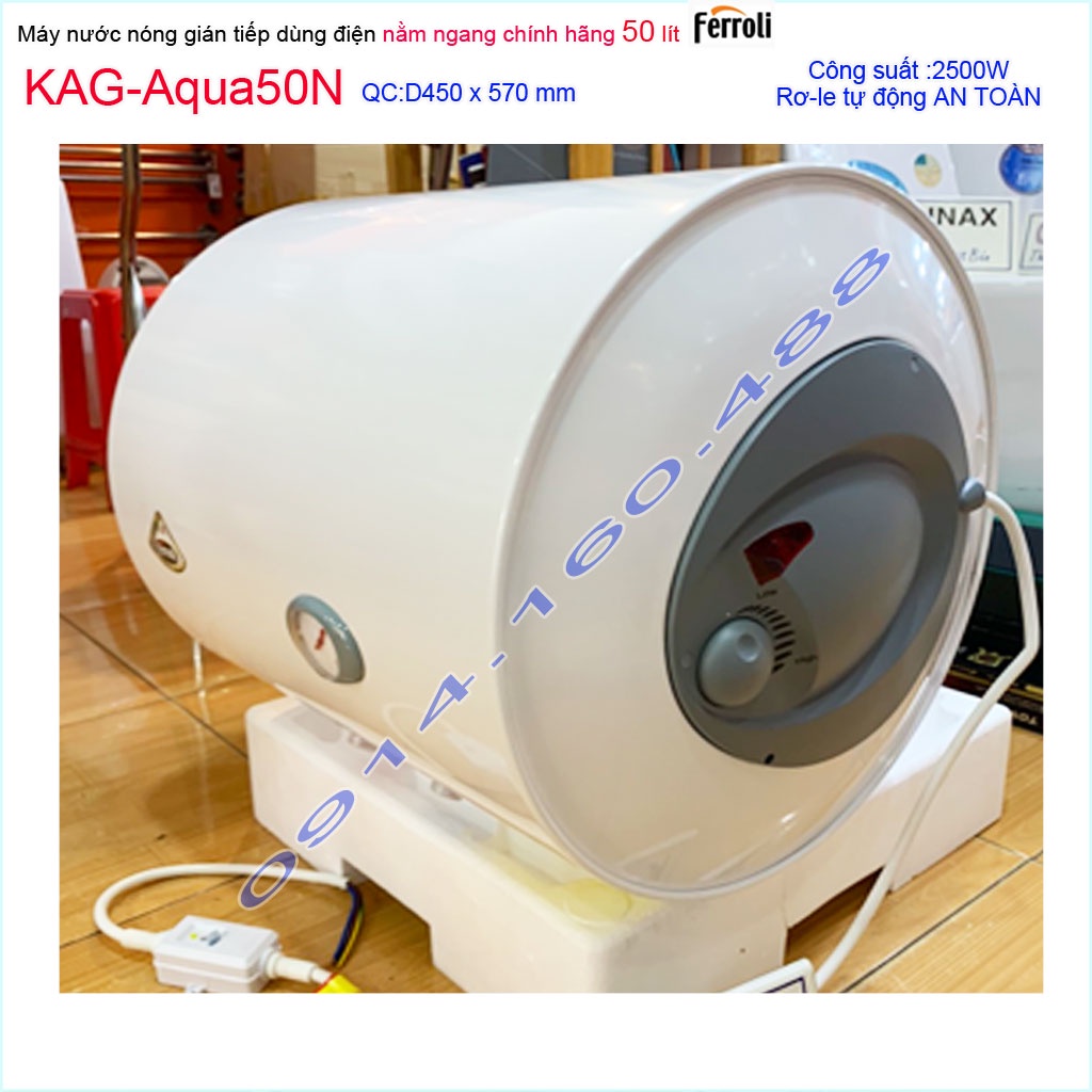 Máy nước nóng Ferroli 50 lít KAG-AQUA50N, bình nước nóng gián tiếp nằm ngang tròn D45cm chống giật hiệu suất sử dụng tốt