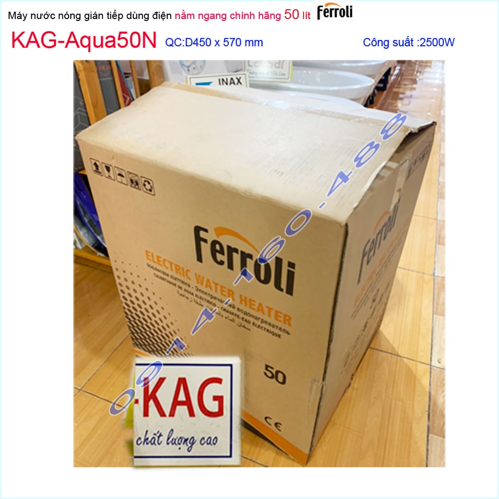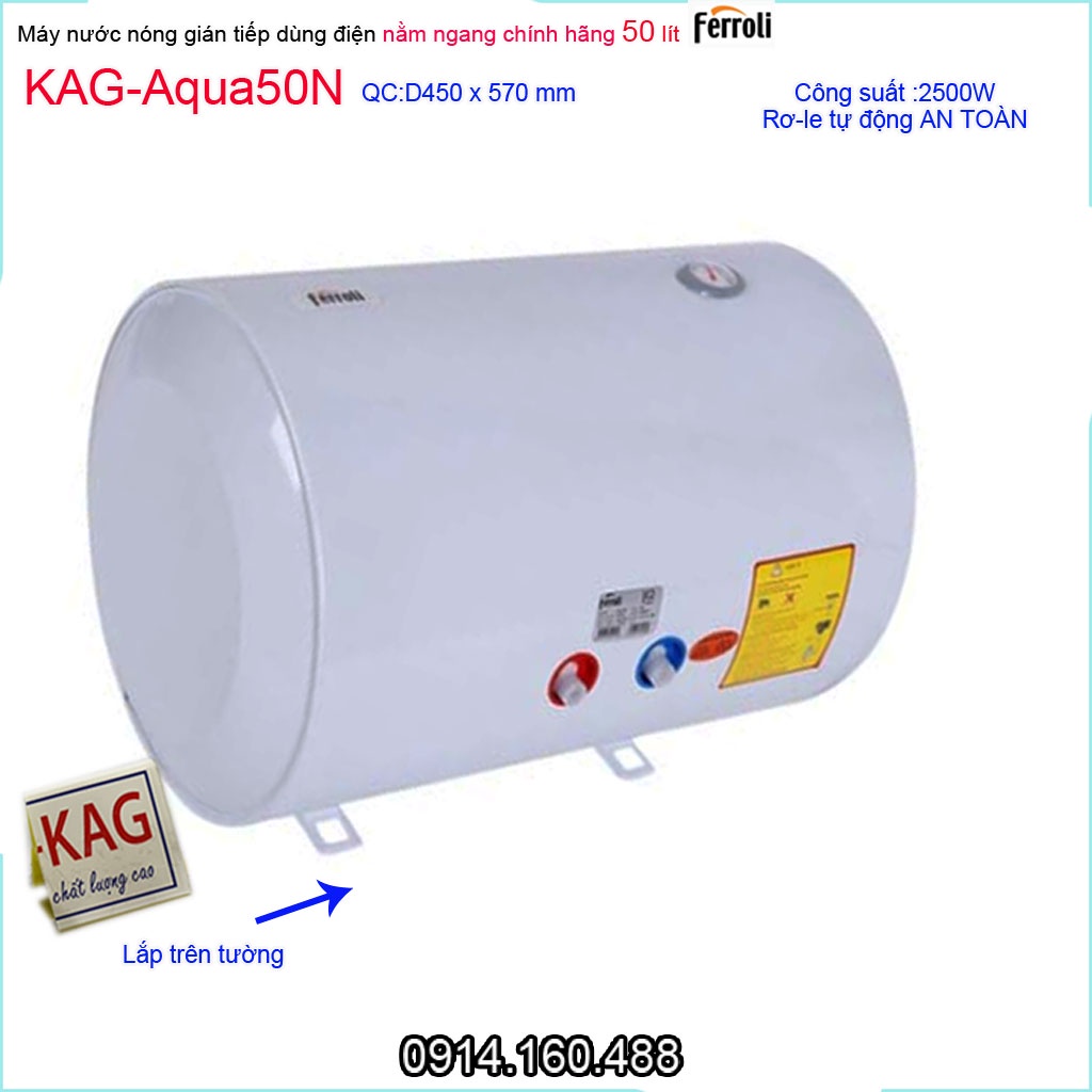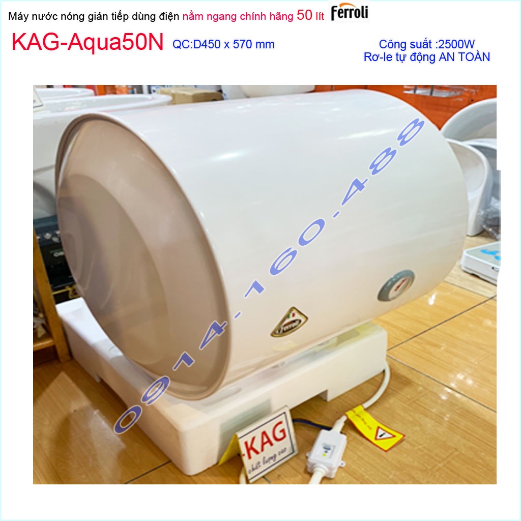 Máy nước nóng Ferroli 50 lít KAG-AQUA50N, bình nước nóng gián tiếp nằm ngang tròn D45cm chống giật hiệu suất sử dụng tốt