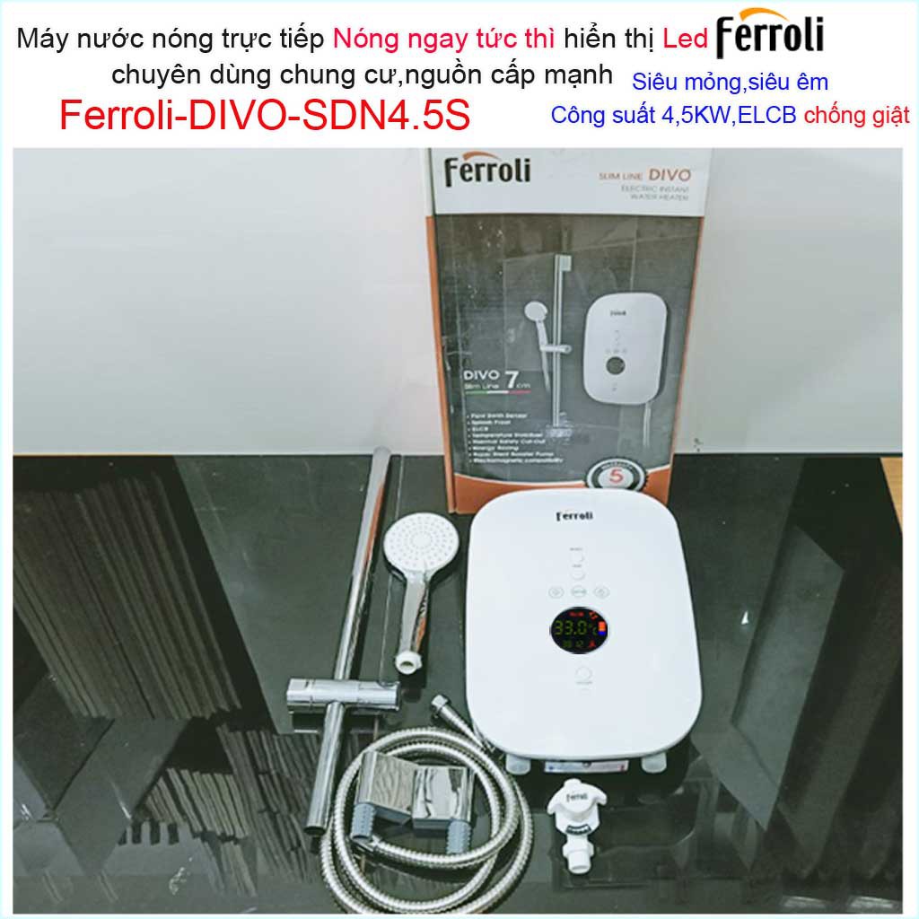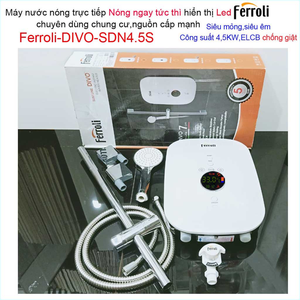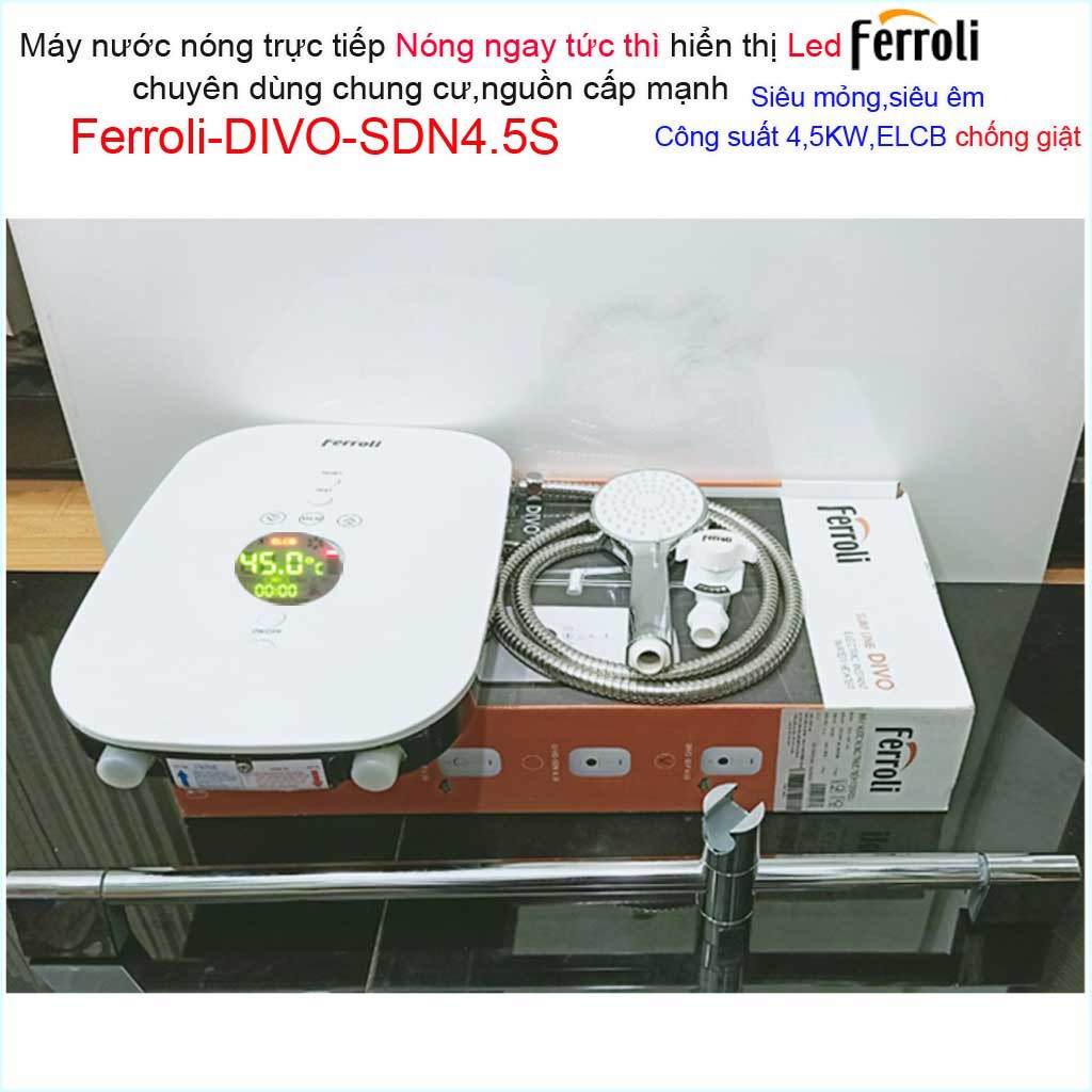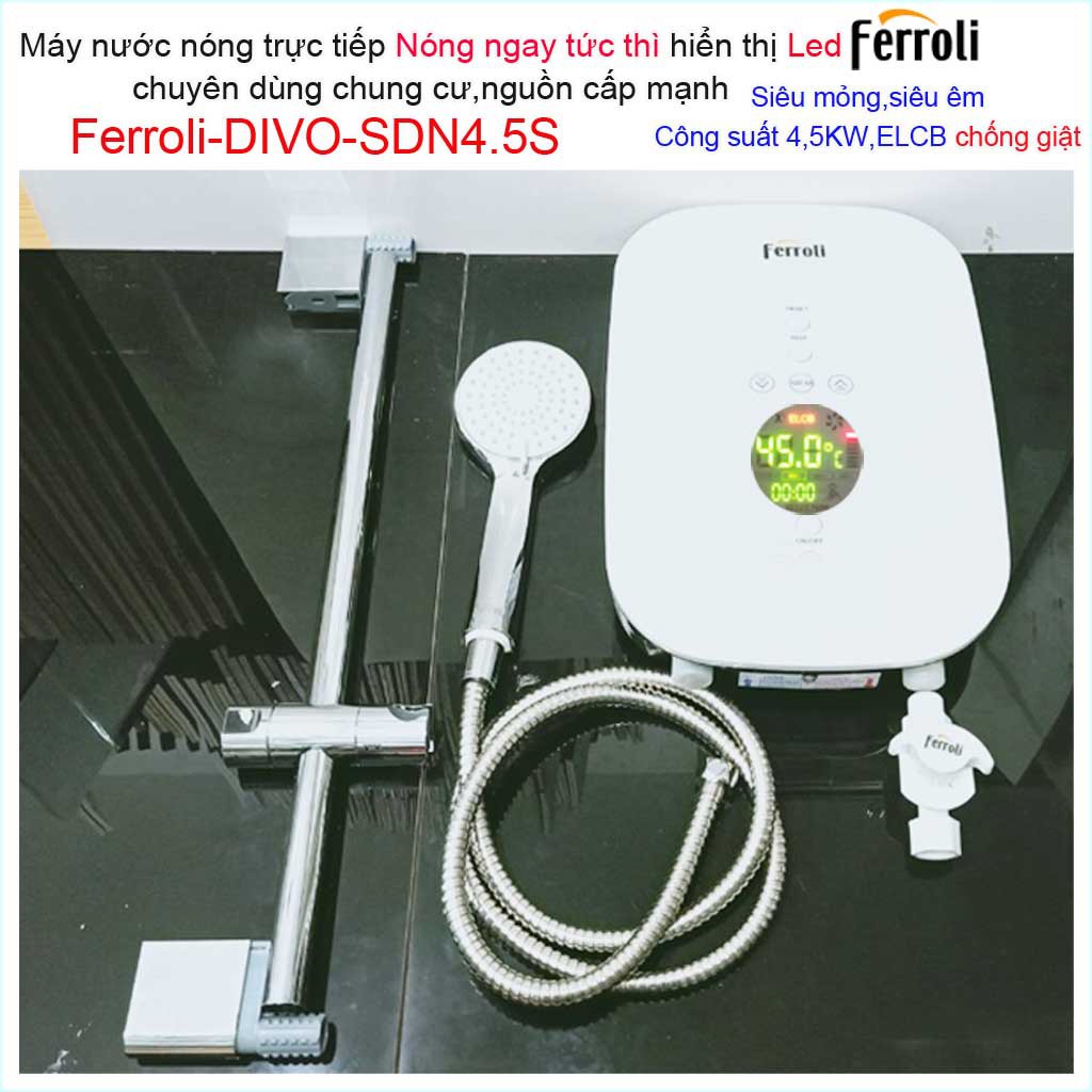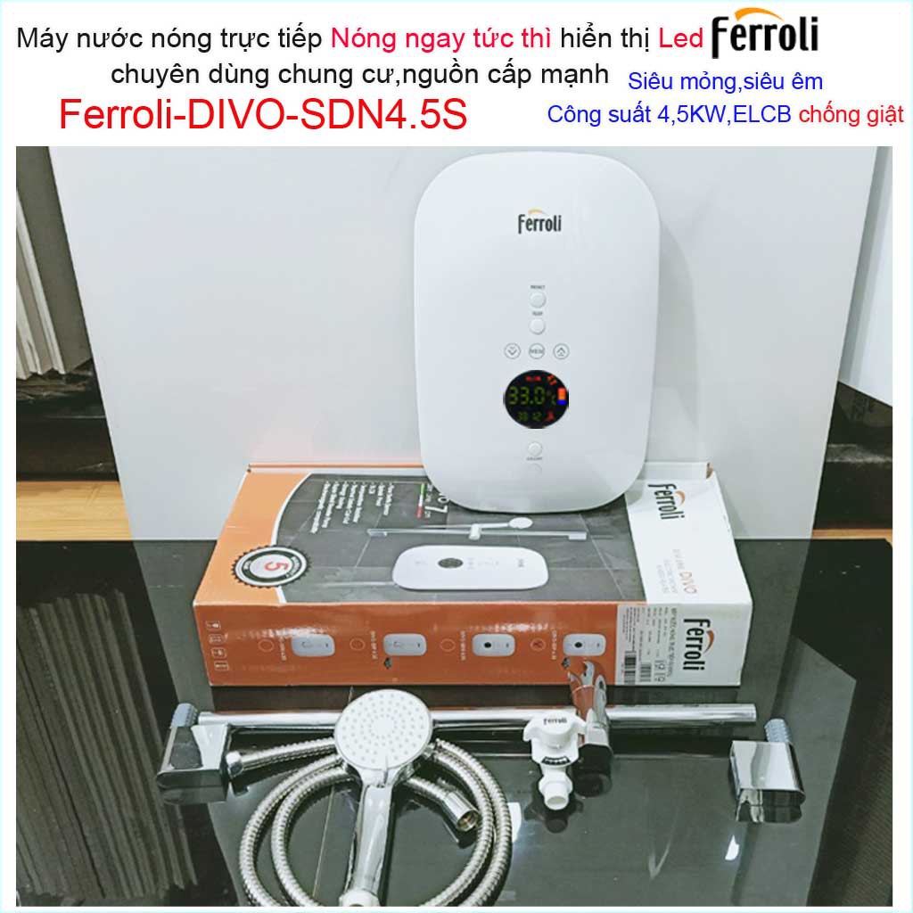 Máy nước nóng Ferroli Divo SDN4.5S màn hình LED hiển thị nhiệt độ, Bình nước nóng trực tiếp Ferroli chính hãng ổn định nhiệt độ nước cho người già vàMáy nước nóng Ferroli được sản xuất tại nhà máy Ferroli -Italy, 1 thương hiệu hàng đầu về máy nước nóng, máy bơm nhiệt, thiết bị nhà bếp.