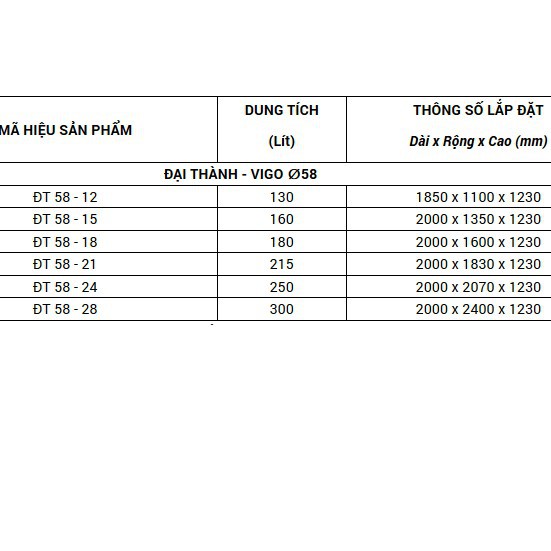 BẢNG GIÁ MÁY NƯỚC NÓNG NĂNG LƯỢNG MẶT TRỜI - VIGO -F58