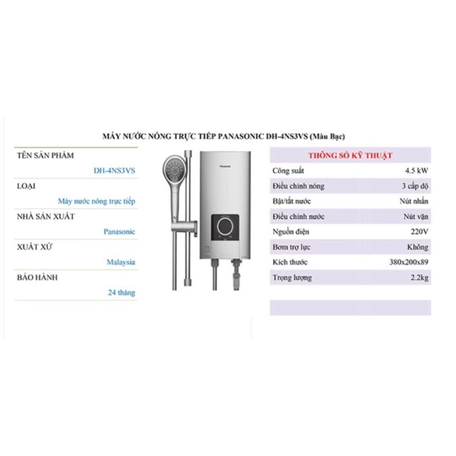 Tư vấn vui lòng liên hệ số ĐT/ZALO. 0986586043Máy nước nóng trực tiếp Panasonic DH-4NS3VS có trang bị tính năng chống giật và tính năng kiểm soát nhiệt nên an tâm tuyệt đối khi sử dụng. Máy được thiết kế nhỏ gọn và sang trọng và vòi sen được thiết kế hiện đại giúp bạn có những giây phút thư giản nhất khi sử dụng..