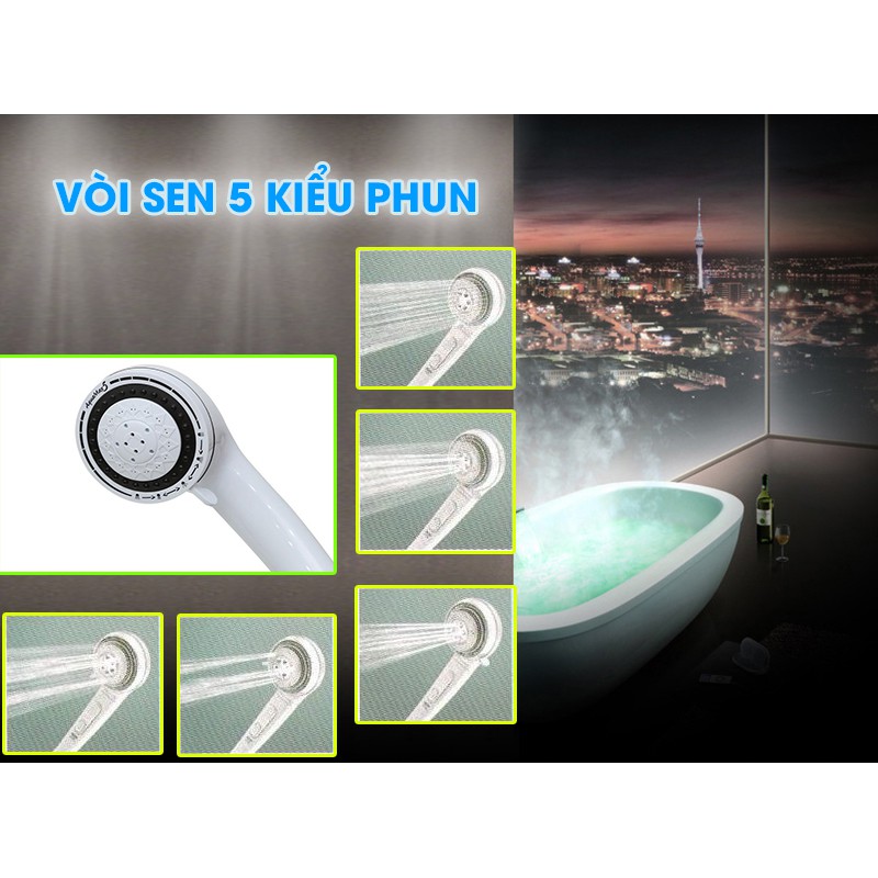 Máy được thiết kế đầu vòi sen cao cấp 5 kiểu phunVới 5 kiểu phun độc đáo vòi sen thế hệ mới mang lại những trải nghiệm hoàn toàn khác biệt phù hợp với nhu cầu của người sử dụng.