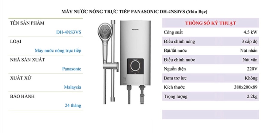 Giới thiệu Máy nước nóng trực tiếp Panasonic DH-4NS3VS không bơm tăng áp