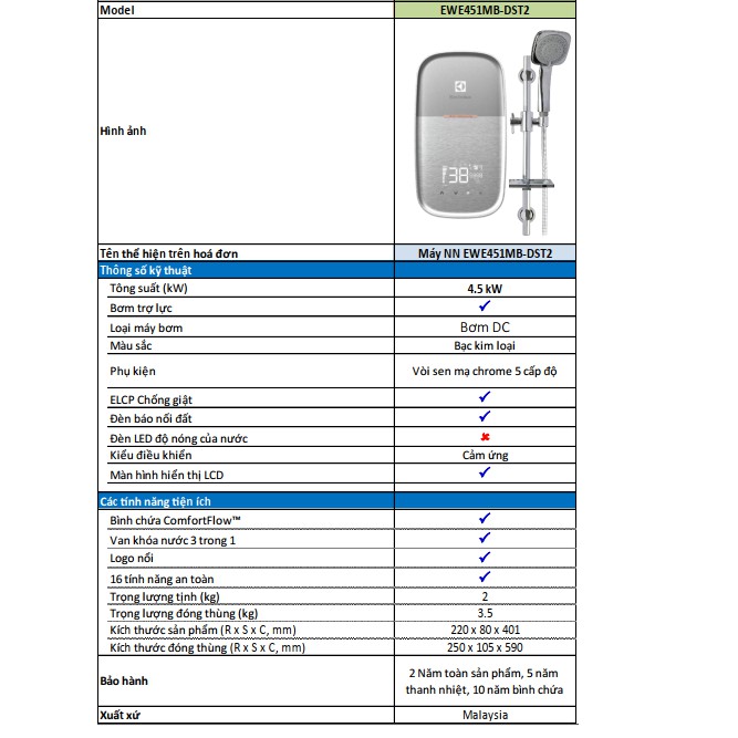 Máy nước nóng trực tiếp Electrolux EWE451MB-DST2Gồm 1 máy và 1 bộ sen tay