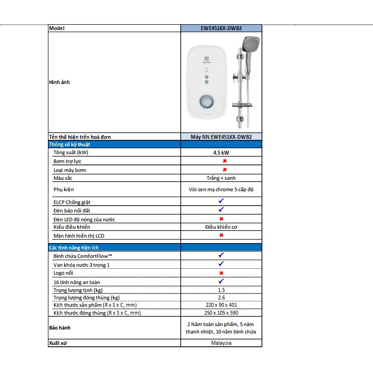 Máy nước nóng trực tiếp Electrolux EWE451KX-DWB2Gồm 1 máy và 1 bộ sen tay