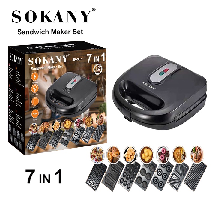 Kẹp nướng bánh Sokany với thiết kế nướng 7 trong 1, với 7 loại vỉ nướng đi kèm bạn có thể làm các loại bánh khác nhau như bánh sandwich, bánh waffle, bánh quy, bánh trứng,... hay nướng thức ăn trực tiếp ngay trên vỉ.