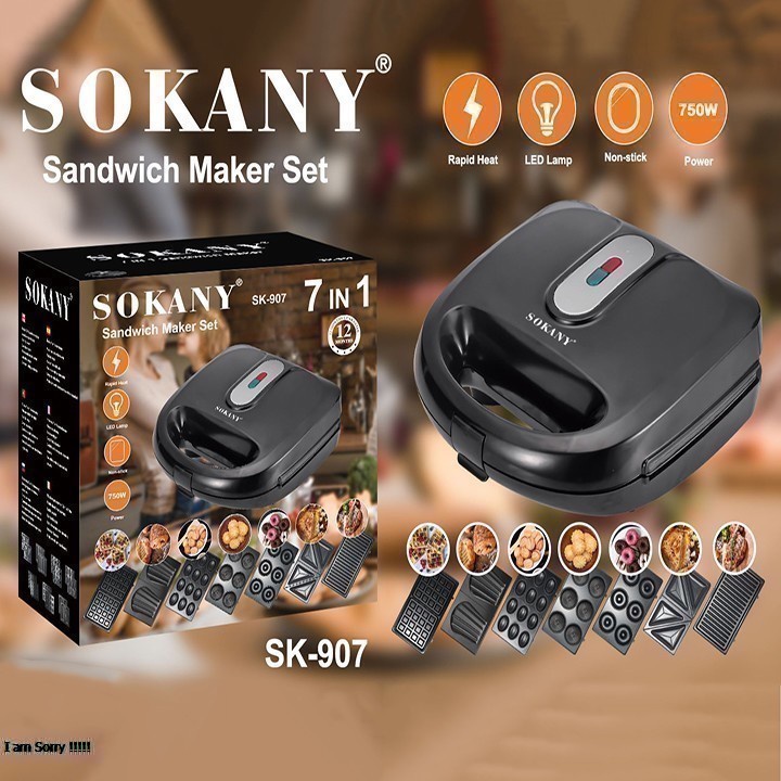 Kẹp nướng bánh Sokany với thiết kế nướng 7 trong 1, với 7 loại vỉ nướng đi kèm bạn có thể làm các loại bánh khác nhau như bánh sandwich, bánh waffle, bánh quy, bánh trứng,... hay nướng thức ăn trực tiếp ngay trên vỉ.