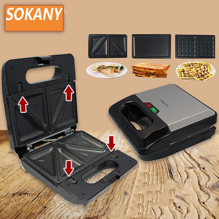 Kẹp nướng bánh Sokany với thiết kế nướng 3 trong 1, với 3 loại vỉ nướng đi kèm bạn có thể làm các loại bánh khác nhau như bánh sandwich, bánh waffle, bánh quy, bánh trứng,... hay nướng thức ăn trực tiếp ngay trên vỉ.