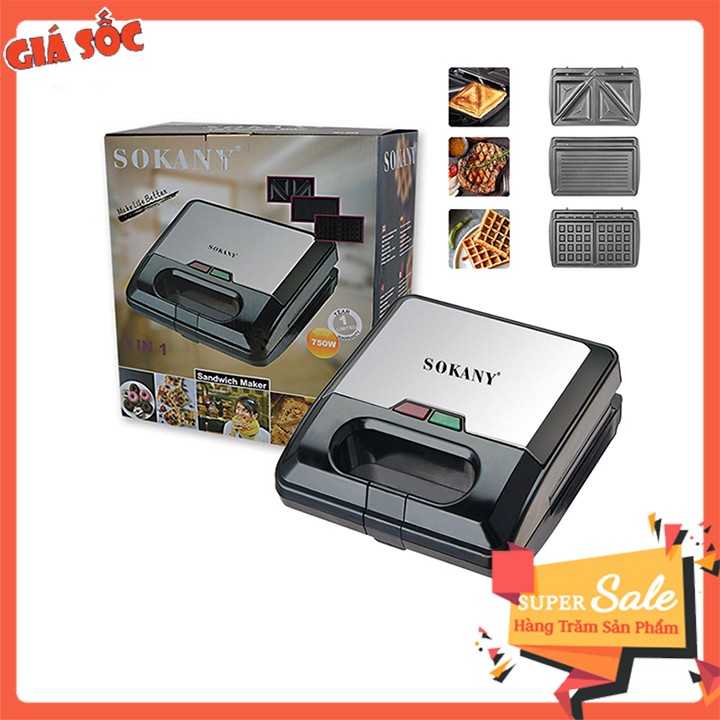 Kẹp nướng bánh Sokany với thiết kế nướng 3 trong 1, với 3 loại vỉ nướng đi kèm bạn có thể làm các loại bánh khác nhau như bánh sandwich, bánh waffle, bánh quy, bánh trứng,... hay nướng thức ăn trực tiếp ngay trên vỉ.