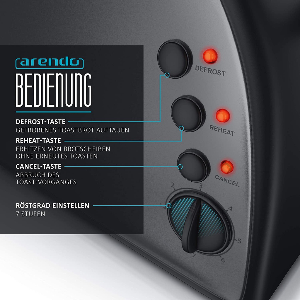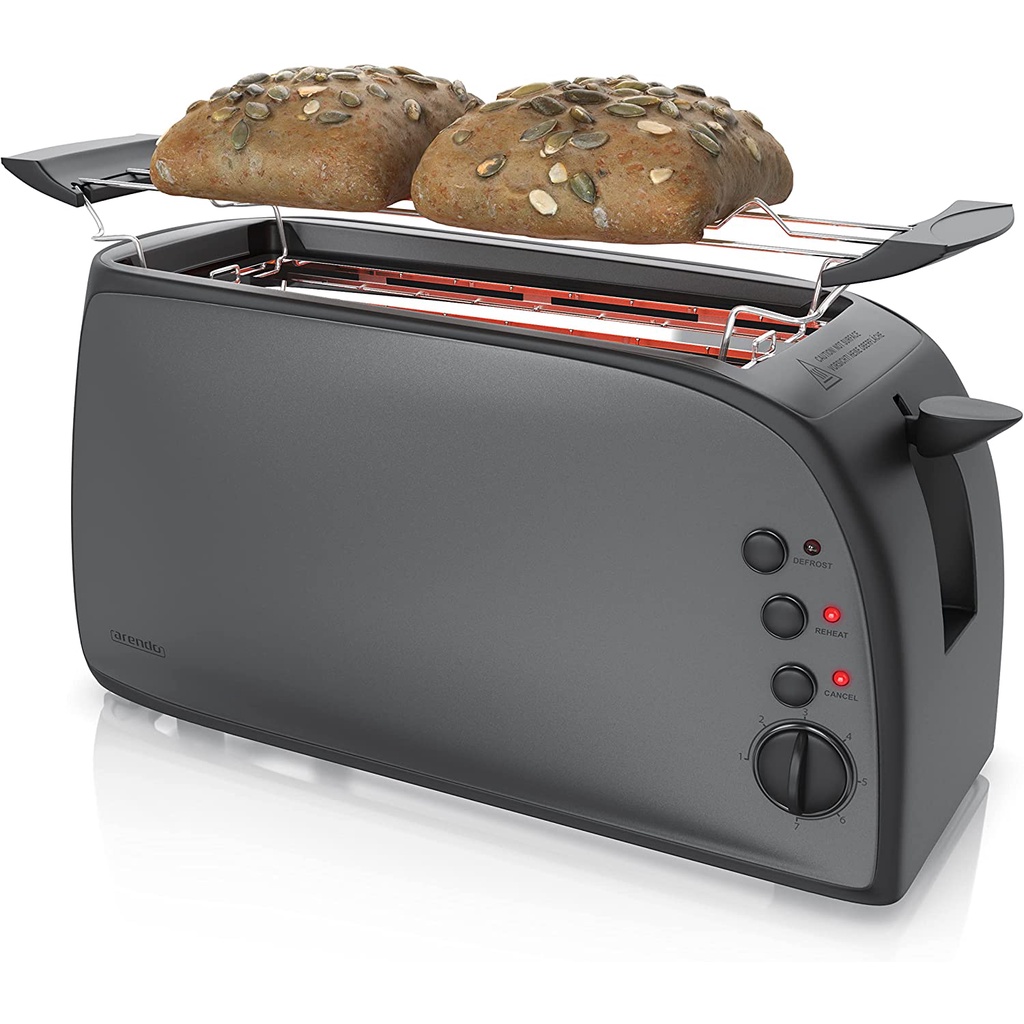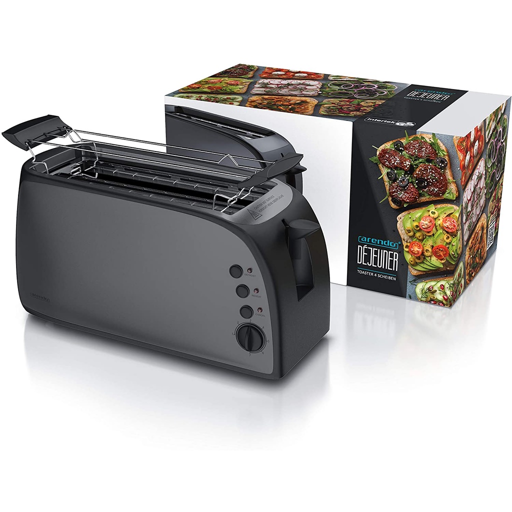 - Máy nướng bánh mì rãnh dài tự động Arendo có bộ phận gắn bánh mì rời và khay đựng vụn bánh mì | lên đến bốn lát bánh mì nướng.