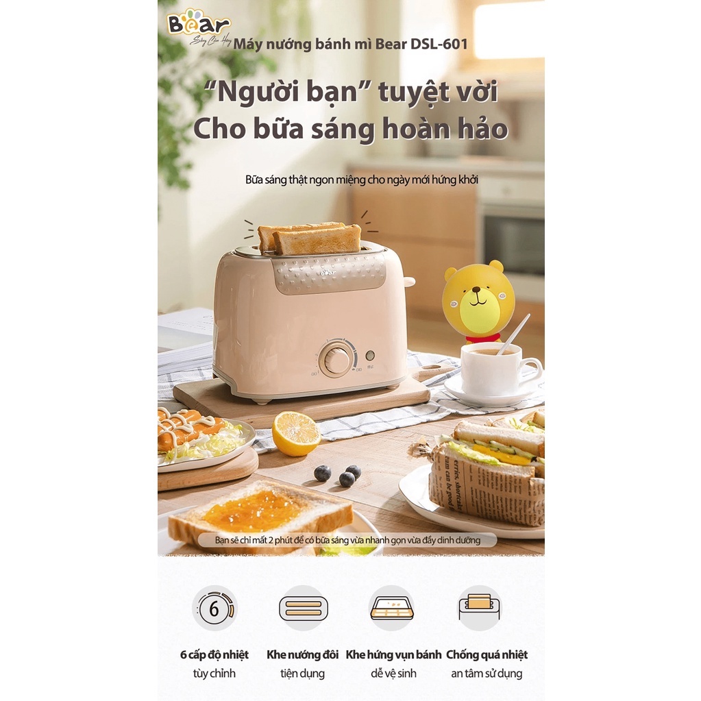 Qua nghiên cứu và khảo sát trực tiếp từ rất nhiều người dùng, từ gia đình nhỏ đến người trẻ thành đạt tại các thành phố lớn, Bear tập trung với sự gọn gàng, dễ sử dụng, tiết kiệm thời gian nhưng vẫn đảm bảo được sự ngon miệng và dinh dưỡng khi tạo ra chiếc máy nướng bánh mì Bear DSL-601. Mỗi sáng, bạn chỉ cần đặt bành mì vào lò, bật máy làm việc, chỉ trong vài phút là bạn đã có ngay bữa sáng đầy dinh dưỡng và ngon miệng.